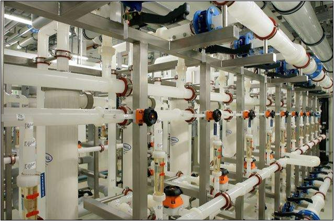 5. 최종 여과: 중공사막 형태의 한외여과막(UF)을 통과시켜 자외선으로 분해되지 않은 고분자 유기물, 미세 입자, 살아있는 균 등을 걸러낸다. 역삼투막(RO)은 필요한 압력을 만들기 위한 펌프 자체가 오염원이 될 수 있어 이 단계에서는 잘 사용되지 않는다. 이상적으로는 냉각용 열교환기로 보내는 펌프의 압력만으로 최종 사용 지점까지 물을 보낼 수 있도록 플랜트를 설계해야 한다.