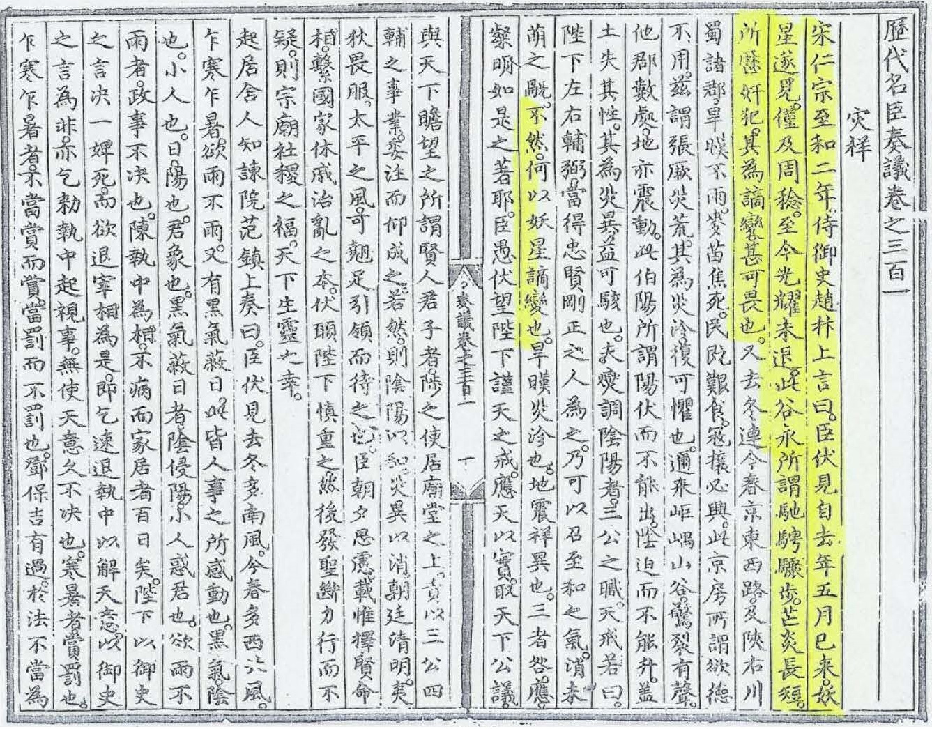 송회요(宋會要)에는 좀 더 구체적인 기록이 있다. 지화 원년 7월 22일, 수장 감치사 양유덕은 객성이 출현하였으며, 그 별은 광채가 아주 밝은 황색이었다고 보고했다. 그는 "'객성이 필수에 미치지 못하였고 밝으니 나라에 대현군자가 나올 일'"이라며 황제의 운을 점치고, 신하들이 축하할 수 있도록 요청했다. 가우 원년 3월, 사천감은 객성이 사라졌다고 보고하며, 처음에는 지화 원년 5월 새벽 동녘에 나타나 천관 옆에서 마치 금성과 같았고, 빛살이 사방으로 퍼졌으며, 색은 붉고 희며, 23일 동안은 낮에도 보였다고 덧붙였다.