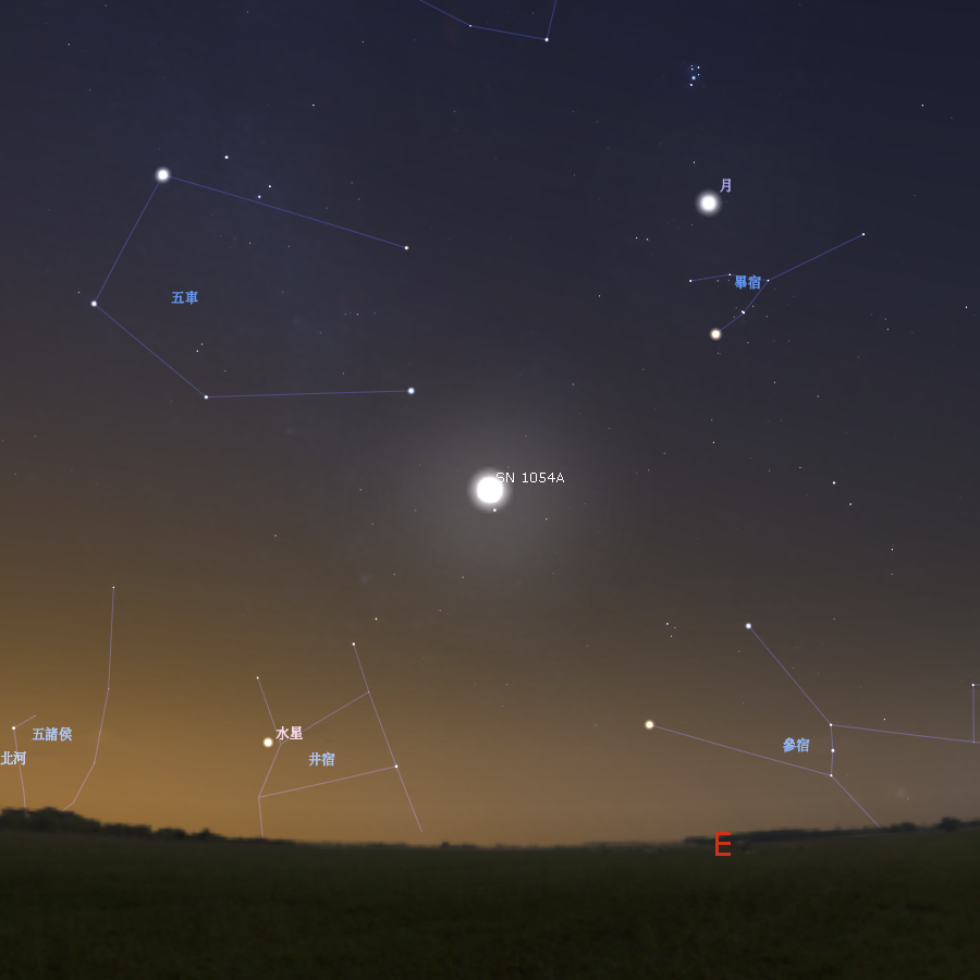 후지와라노 사다이에(藤原定家)의 일기인 메이게츠키(明月記)에는 SN 1054에 대한 기록이 남아 있다.[45] 메이게츠키에는 1054년 5월 하순(덴키 2년 4월 중순 이후 축시)에 객성이 자수와 삼수 부근(현재의 오리온자리) 동방에 나타났으며, 그 크기가 목성과 같았다는 기록이 있다.[45]