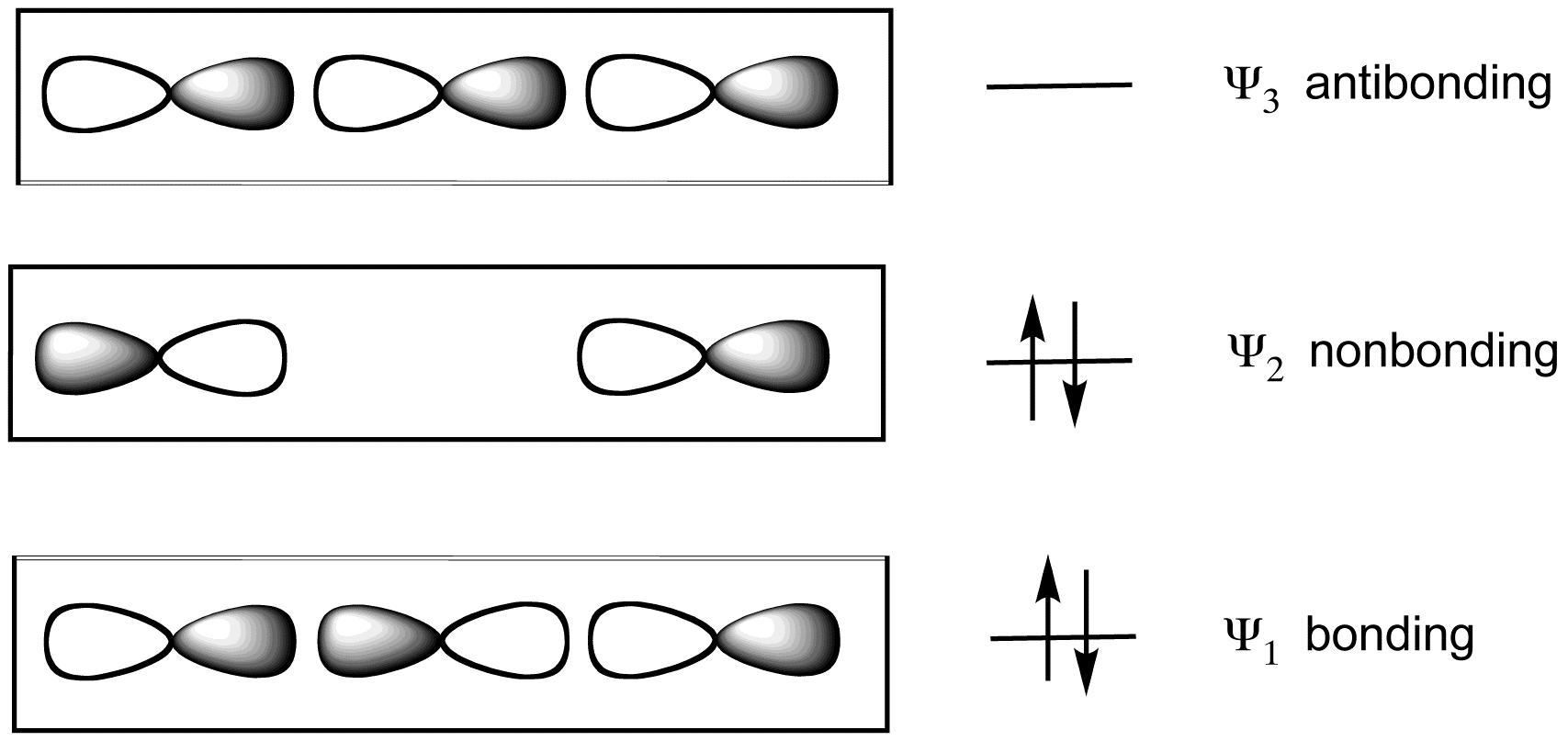 한편, 초원자가 결합을 설명하는 또 다른 모델인 세 중심 사전자 결합(3c-4e) 모델은 분자 궤도 이론의 관점에서 정성적으로 이해될 수 있다. 3c-4e 결합은 중심 원자의 p 오비탈과 축 방향의 두 리간드 원자 오비탈의 선형 결합으로 형성되는 3개의 분자 궤도(결합성, 비결합성, 반결합성)로 설명된다. 이 3개의 MO에 4개의 전자가 채워지는데, 2개는 결합성 MO에, 나머지 2개는 비결합성 MO에 채워져 전체적으로 결합을 형성한다. 이 모델 역시 중심 원자가 옥텟 규칙을 위반하지 않으면서 초원자가 상태를 설명하는 방법 중 하나이다.[3][39]