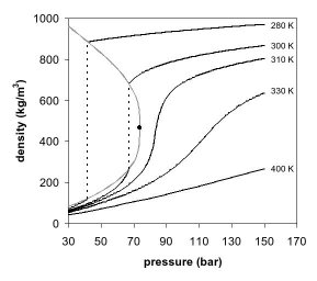 이산화 탄소의 밀도-압력 상 평형 그림(그림 2)에서도 단일 상의 출현을 관찰할 수 있다. 임계 온도보다 훨씬 낮은 온도(예: 280 K)에서 압력이 증가하면 기체가 압축되고, 결국 40 바를 약간 넘어 훨씬 밀도가 높은 액체로 응축된다. 이때 선에 불연속성이 나타난다(수직 점선). 이 시스템은 화학 평형 상태에 있는 두 개의 상, 즉 고밀도 액체와 저밀도 기체로 구성된다. 임계 온도(300 K)에 가까워질수록 평형 상태의 기체 밀도는 높아지고 액체 밀도는 낮아진다. 임계점(304.1 K, 7.38 MPa (73.8 바))에서는 밀도 차이가 없어지며, 두 개의 상은 하나의 유체 상이 된다. 따라서 임계 온도 이상에서는 압력을 가해도 기체를 액화할 수 없다. 임계 온도보다 약간 높은 온도(310 K)에서는 임계 압력 근처에서 선이 거의 수직이 된다. 압력이 약간만 증가해도 초임계 상의 밀도가 크게 증가한다. 점도, 상대 유전율, 용매 강도 등 다른 많은 물리적 특성도 임계점 근처에서 압력에 따라 큰 기울기를 보이는데, 이는 모두 밀도와 밀접한 관련이 있기 때문이다. 온도가 더 높아지면 유체는 이상 기체와 유사하게 행동하기 시작하며, 그림 2에서 볼 수 있듯이 밀도와 압력 관계가 더 선형적으로 나타난다. 이산화 탄소의 경우 400 K에서 밀도는 압력에 따라 거의 선형적으로 증가한다.
