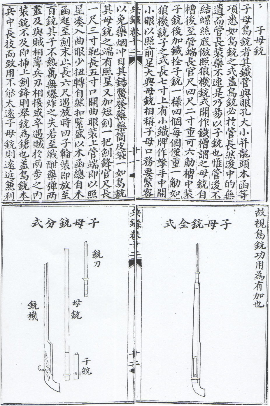 1606년 중국산 초기 화승총에 장착된 플러그식 총검의 묘사. 무기의 설명서와 사양이 위에 표시되어 있다.