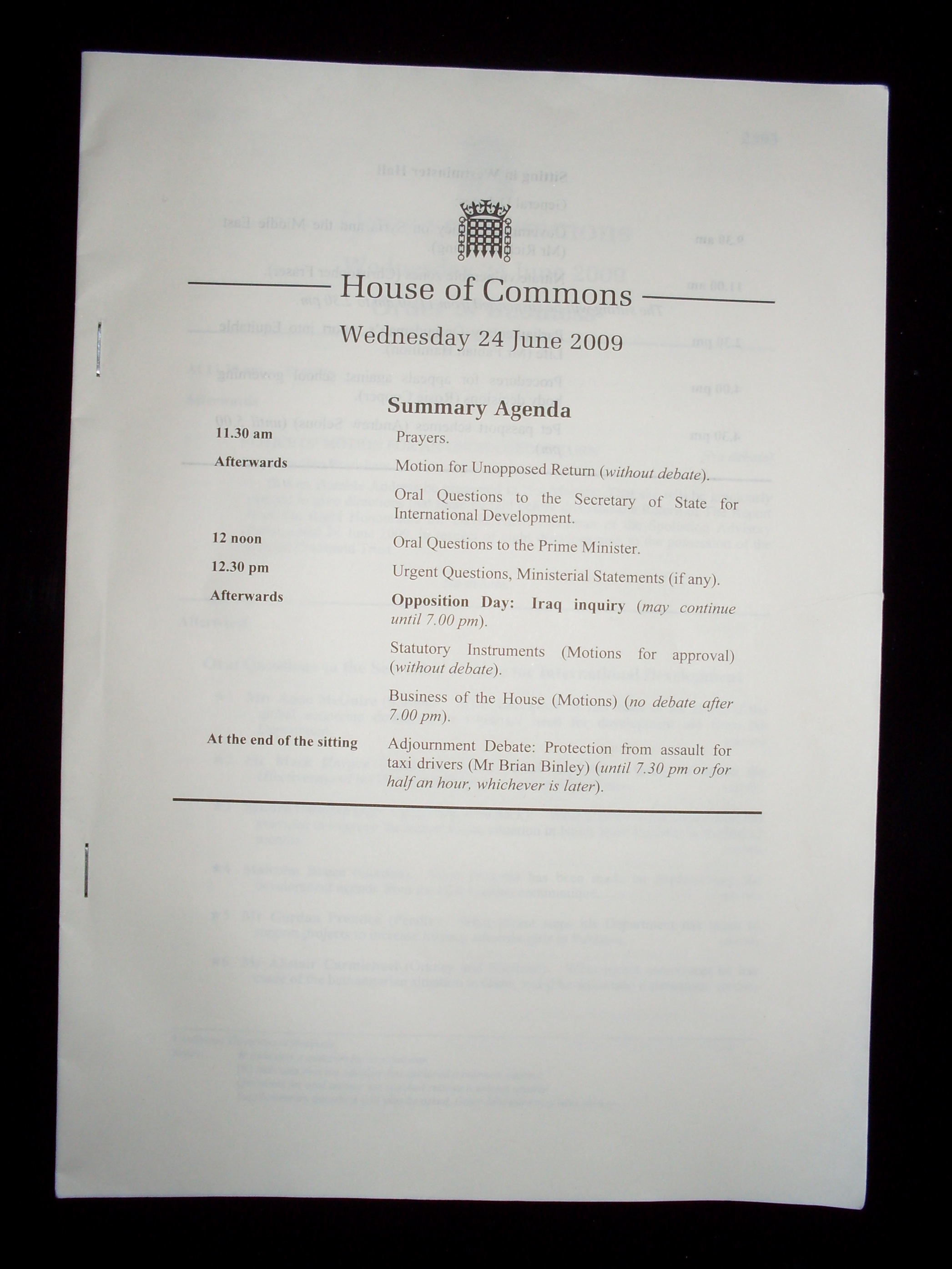 오더 페이퍼에 따른 공식 질의가 시작되면 "의장님, 첫번째입니다" (Number one, Mr. Speaker)라고 운을 뗀 뒤, "총리께서 금일 업무를 말씀해주실 수 있는지" (if he/she will list his/her engagements for the day)라고 묻는 것이 일반적이다. 그러면 총리는 "오늘 아침 저는 장관 동료들과 다른 사람들과 회의를 가졌습니다. 본 의회의 의무 외에도 오늘 늦게 추가 회의를 가질 것입니다."라고 답한다.[44]