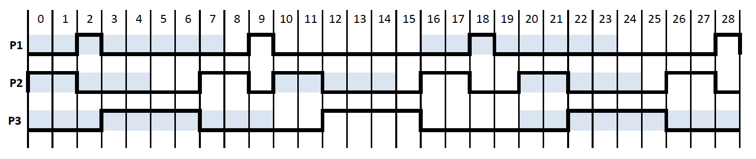 타이밍 다이어그램에서 열은 시간이 오른쪽으로 증가하는 시간 슬라이스를 나타내며, 모든 프로세스는 시간 슬라이스 0에서 주기를 시작한다. 타이밍 다이어그램의 파란색과 흰색 음영이 번갈아 나타나는 것은 각 프로세스의 주기를 나타내며, 색상 변경 시 마감 시간이 적용된다.
