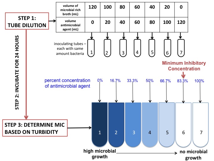 항균제 농도는 항균제 원액을 배지와 혼합하여 적절한 농도로 조정한다. 조정된 항균제는 구배를 얻기 위해 여러 개의 튜브(또는 웰)로 계열 희석된다.[21] 희석률은 중단점 및 실무자의 필요에 따라 조정할 수 있다. 미생물, 즉 접종제는 동일한 집락 형성 단위에서 가져와야 하며 올바른 농도여야 한다. 이는 배양 시간과 희석에 따라 조정할 수 있다. 확인을 위해 양성 대조군은 100배 희석하여 집락 형성 단위를 계산한다. 미생물은 튜브(또는 플레이트)를 접종하고 16~20시간 동안 배양한다. MIC는 일반적으로 탁도로 결정된다.[21]