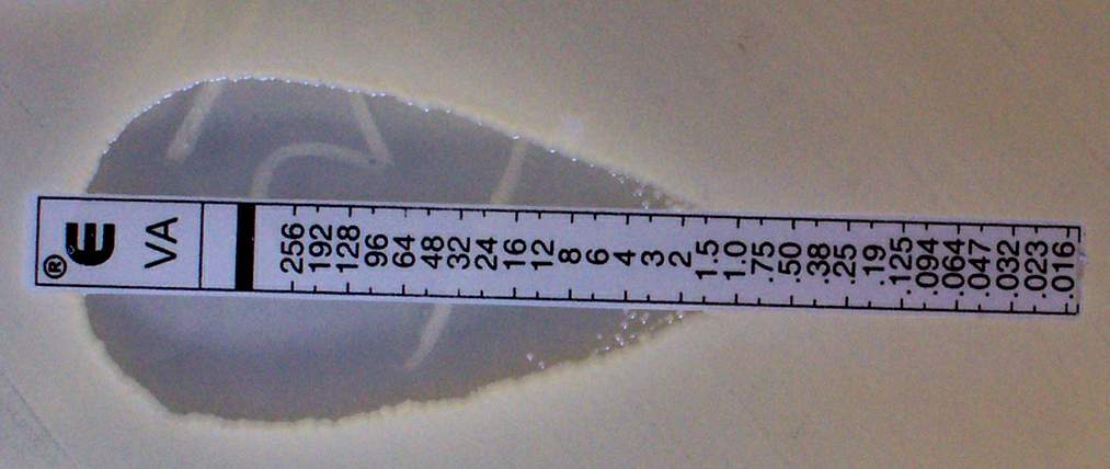 Etest는 다양한 미생물에 대한 광범위한 항균제의 최소 저지 농도를 결정하는 방법으로 사용될 수 있다.[22] bioMérieux에서 제조한 Etest는 항생제의 사전 정의된 기울기를 가진 바로 사용 가능한 다공성이 없는 플라스틱 시약 스트립으로, 연속적인 농도 범위를 포함한다.[22] 필요한 배양 기간이 지난 후, 균일한 생장면이 뚜렷하게 보이면, 억제 타원의 뾰족한 끝이 스트립의 측면과 교차하는 지점에서 MIC 값을 읽는다.
