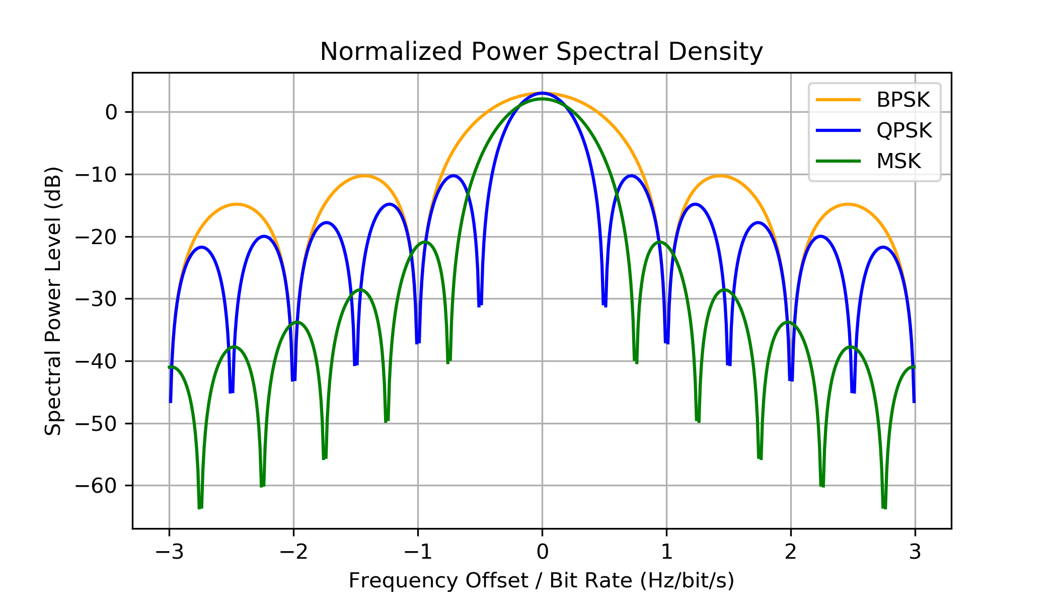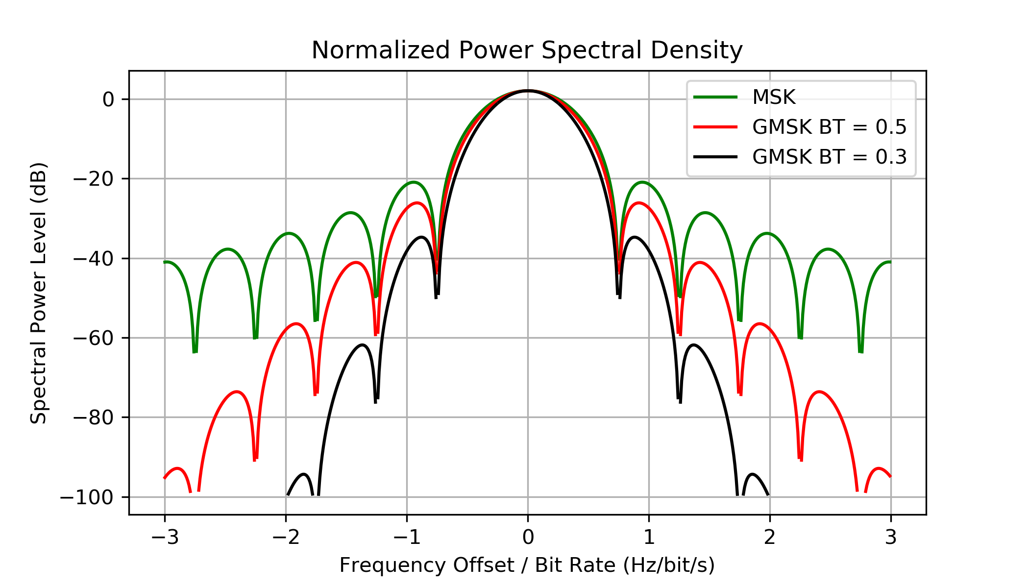 GMSK는 스펙트럼 효율이 높지만, 같은 양의 데이터를 확실하게 전송하려면 QPSK보다 높은 전력 레벨이 필요하다.[8]참조