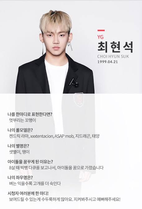 최현석은 1999년 서울 강남구 출생으로, 대한민국의 보이 그룹 TREASURE의 리더이자 래퍼이다. 그는 YG 엔터테인먼트에서 연습생 생활을 시작하여, 오디션 프로그램 《믹스나인》에 출연해 최종 5위를 기록했으나 데뷔가 무산되었다. 이후 《YG 보석함》을 통해 TREASURE의 멤버로 데뷔, 2020년 싱글 앨범 《THE FIRST STEP : CHAPTER ONE》을 발매했다. 랩 메이킹과 작사 능력이 뛰어나며, 다양한 방송 출연과 웹 드라마 출연을 통해 활동 범위를 넓혔다.