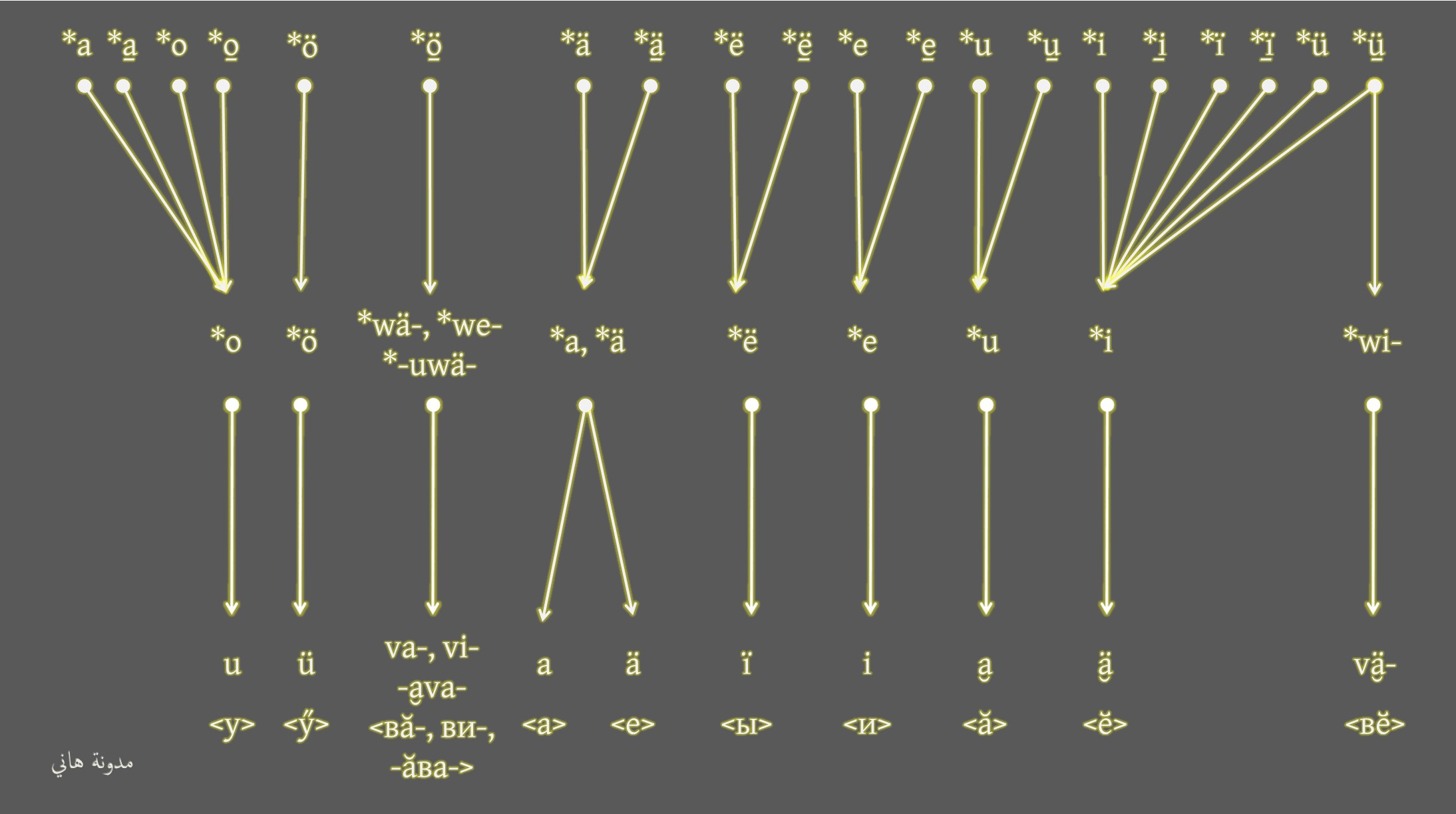 - ''Ineq'' (암소) → ''Ĕne'' (추바시어, 원래는 ''Ĕneh'')