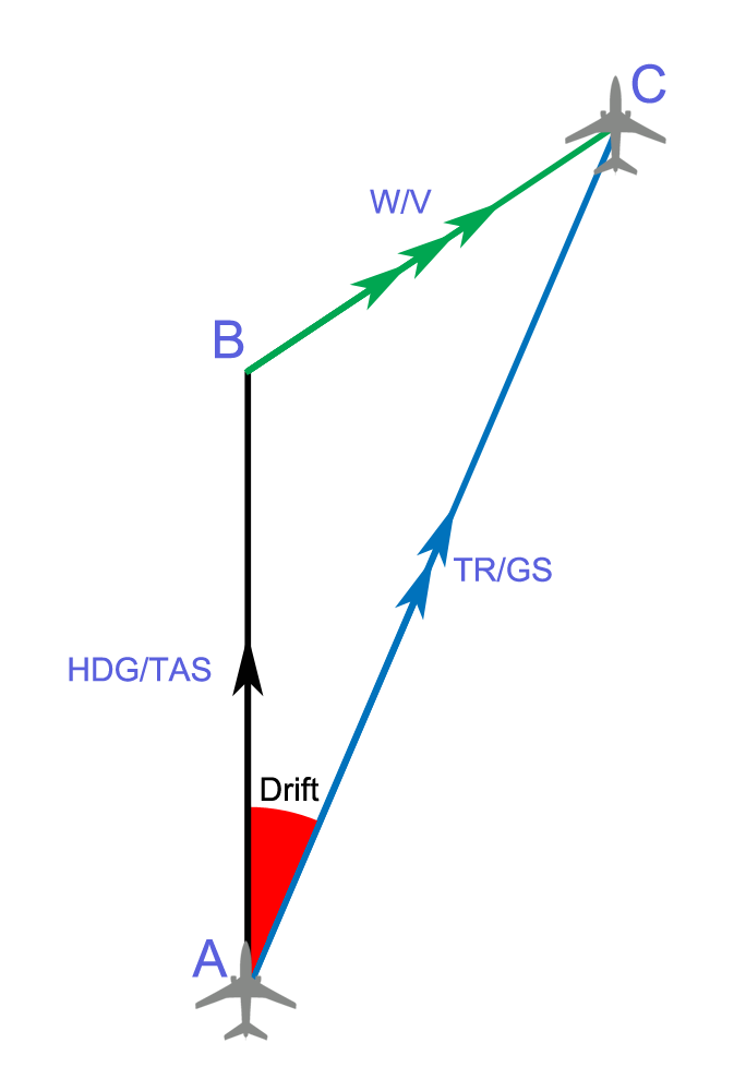 드리프트(Drift)는 매체의 속도를 고려하지 않아 추측 항법에서 발생할 수 있는 오차이다. A는 마지막으로 알려진 위치(고정), B는 추측 항법으로 계산된 위치, C는 시간 간격 후의 실제 위치이다. A에서 B까지의 벡터는 초기 방위각(HDG)과 진대기 속도(TAS)를 기반으로 한 항공기의 예상 경로이다. B에서 C까지의 벡터는 풍속(W/V)이며, 세 번째 벡터는 실제 항적(TR) 및 대지 속도(GS)이다. 드리프트 각도는 빨간색으로 표시된다.