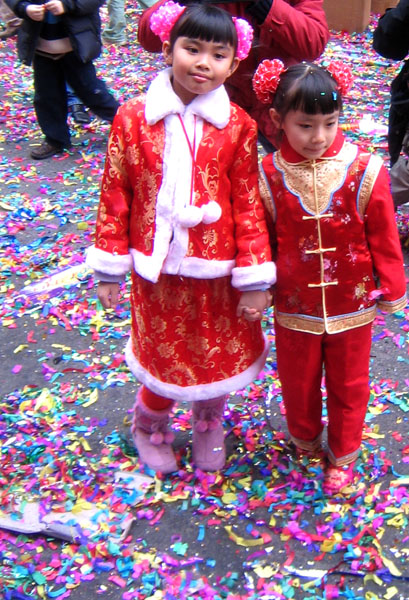 붉은색은 중국 설날에 널리 입는 색깔이다. 전통적인 믿음에 따르면 붉은색은 악령을 쫓을 수 있다고 한다.[104] 새 옷을 입는 것은 명절 기간 동안의 또 다른 의복 관습이다.[105] 새 옷은 새해의 새로운 시작을 상징한다.[104]