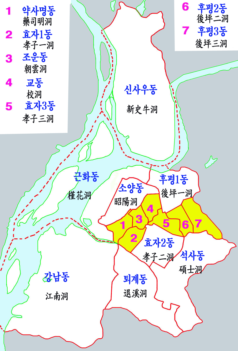 후평1동 | 後坪一洞 | 1.86km2 | 6,013 | 12,862 |