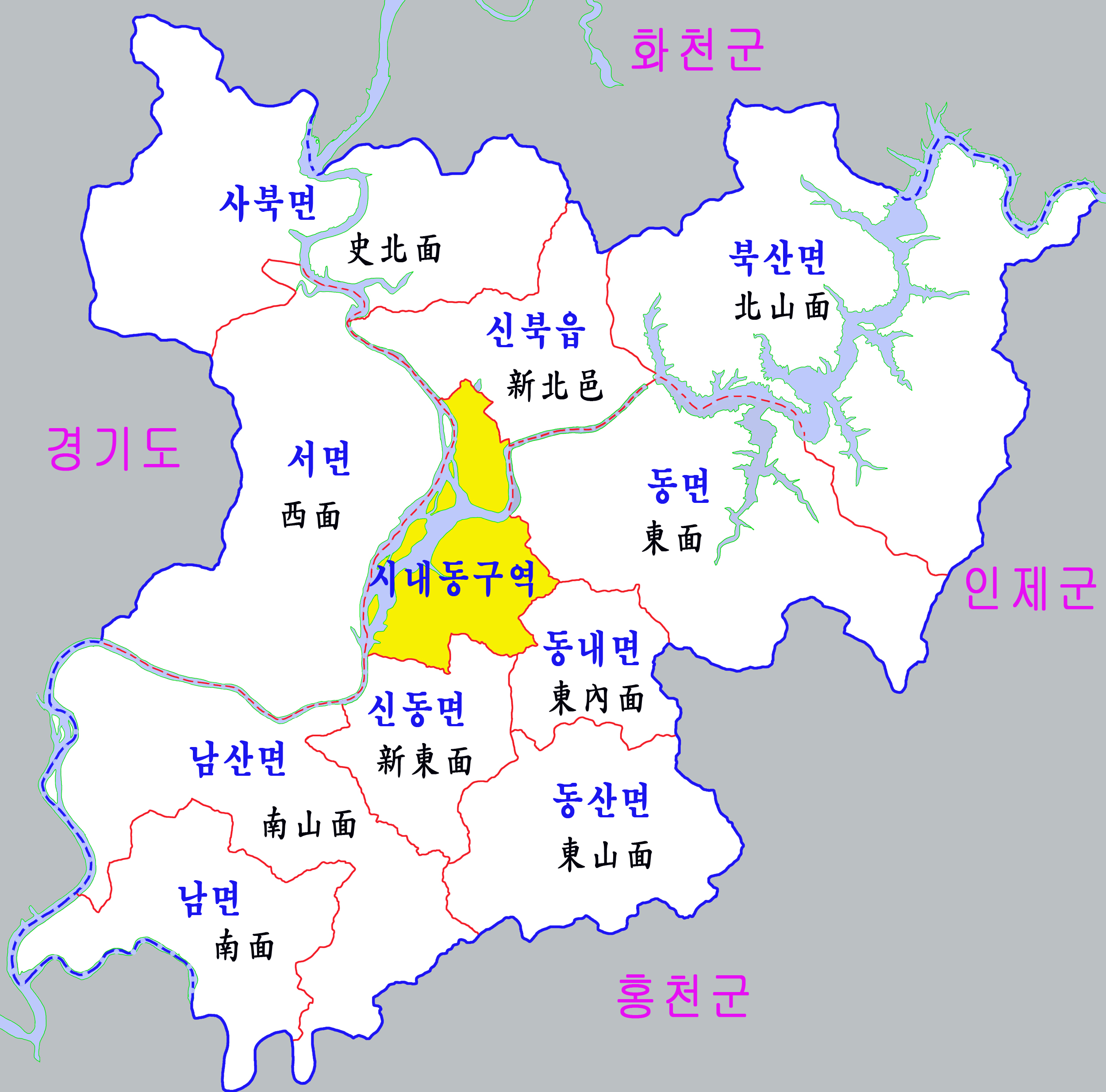 신동면 | 新東面 | 48.19km2 | 1,060 | 2,542 |