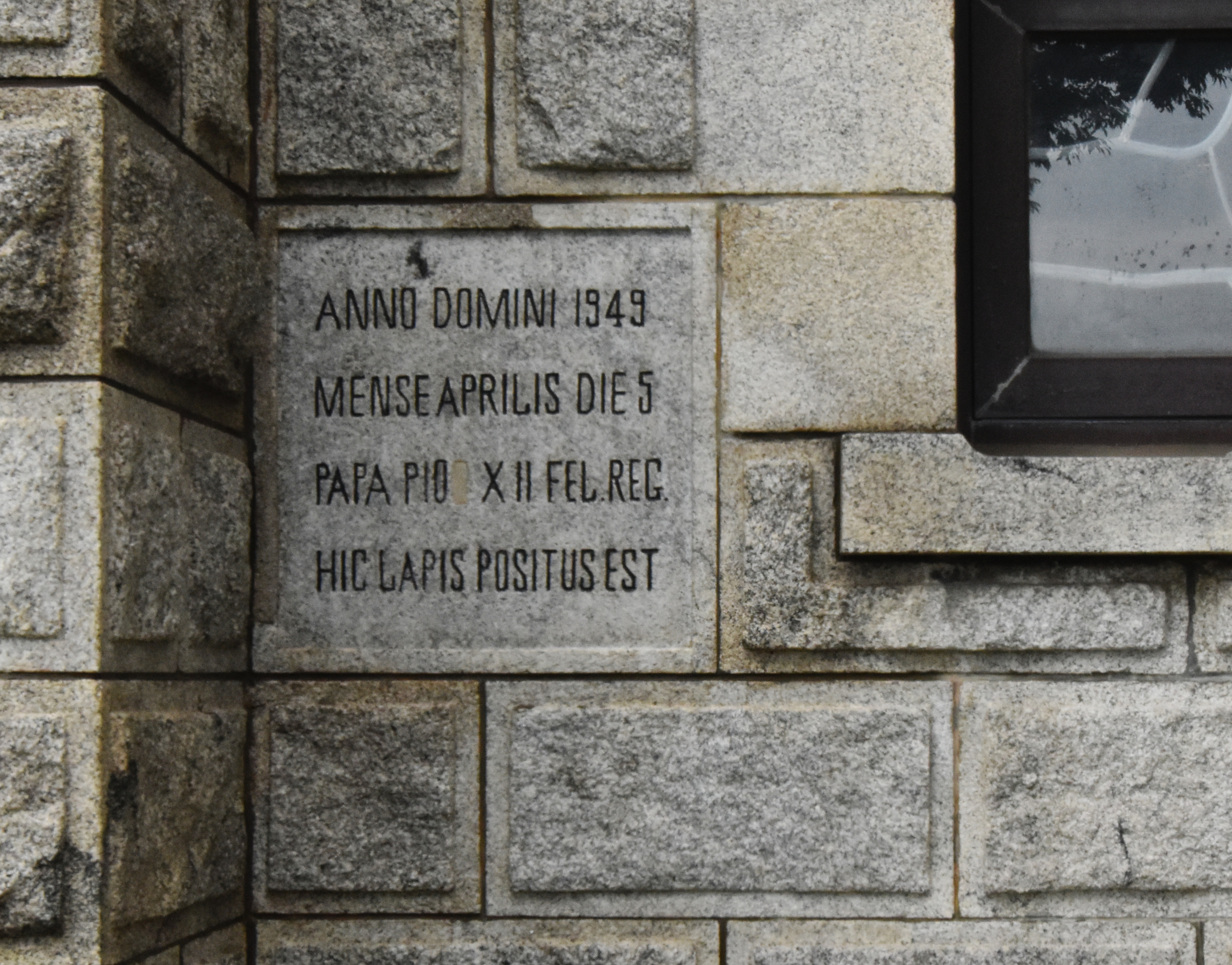 죽림동 주교좌성당의 주춧돌. 기공식이 열린 1949년의 날짜와 당시 교황이던 비오 12세의 이름이 새겨져 있다.