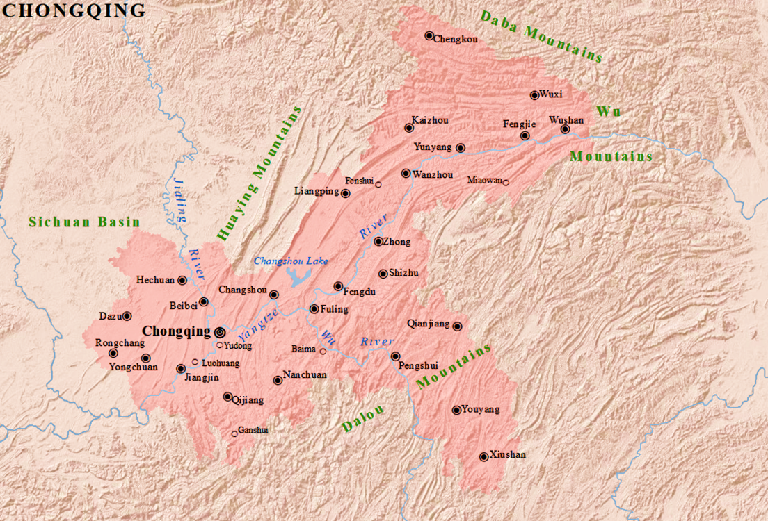 1997년 | 덩샤오핑의 서부 대개발 정책으로 직할시 재승격, 푸링 시, 완셴 시, 첸장 지구 편입, 싼샤 댐 수몰민 재정착 |