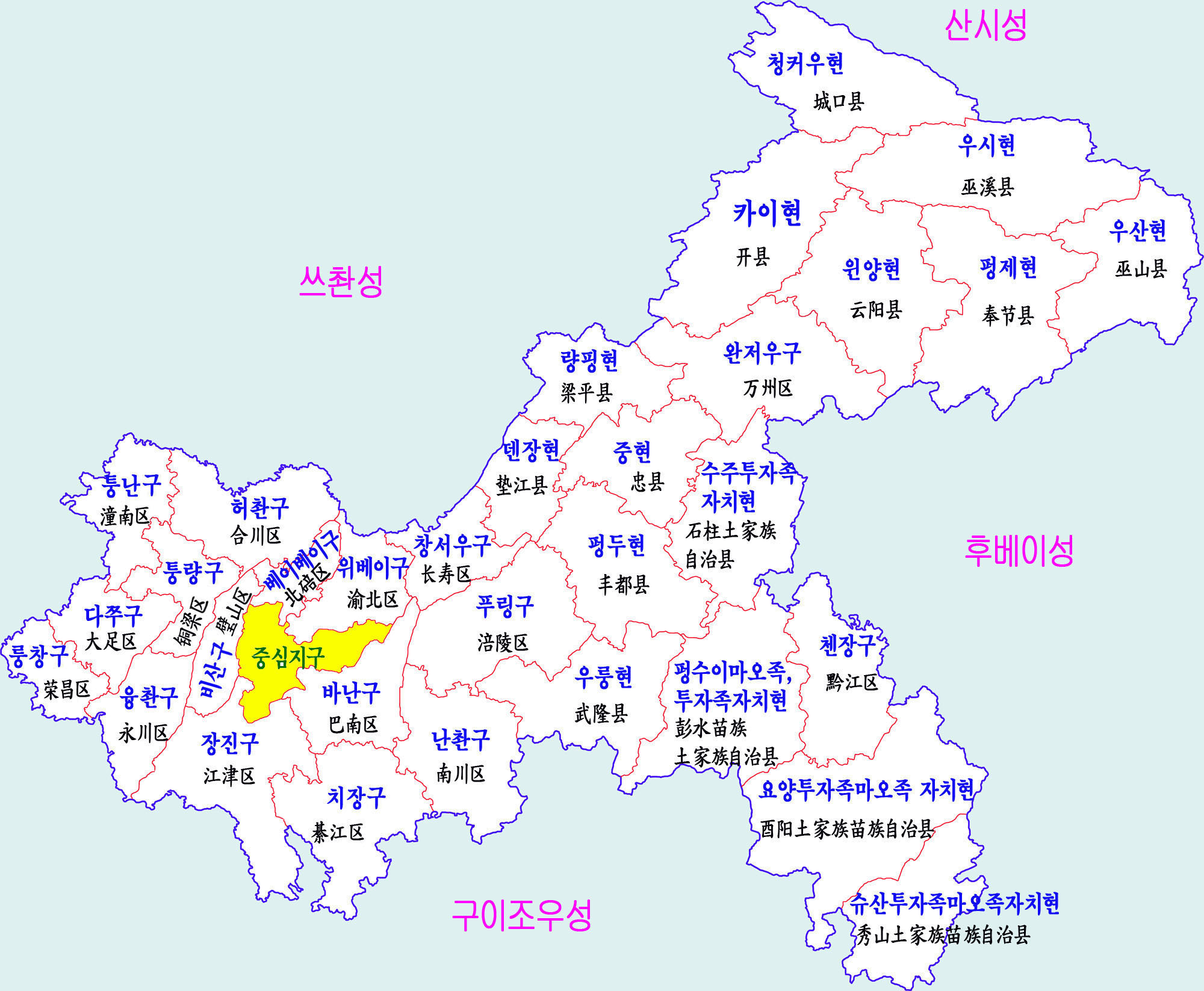 충칭시는 26개의 구, 8개의 현, 4개의 자치현으로 구성되어 있다.