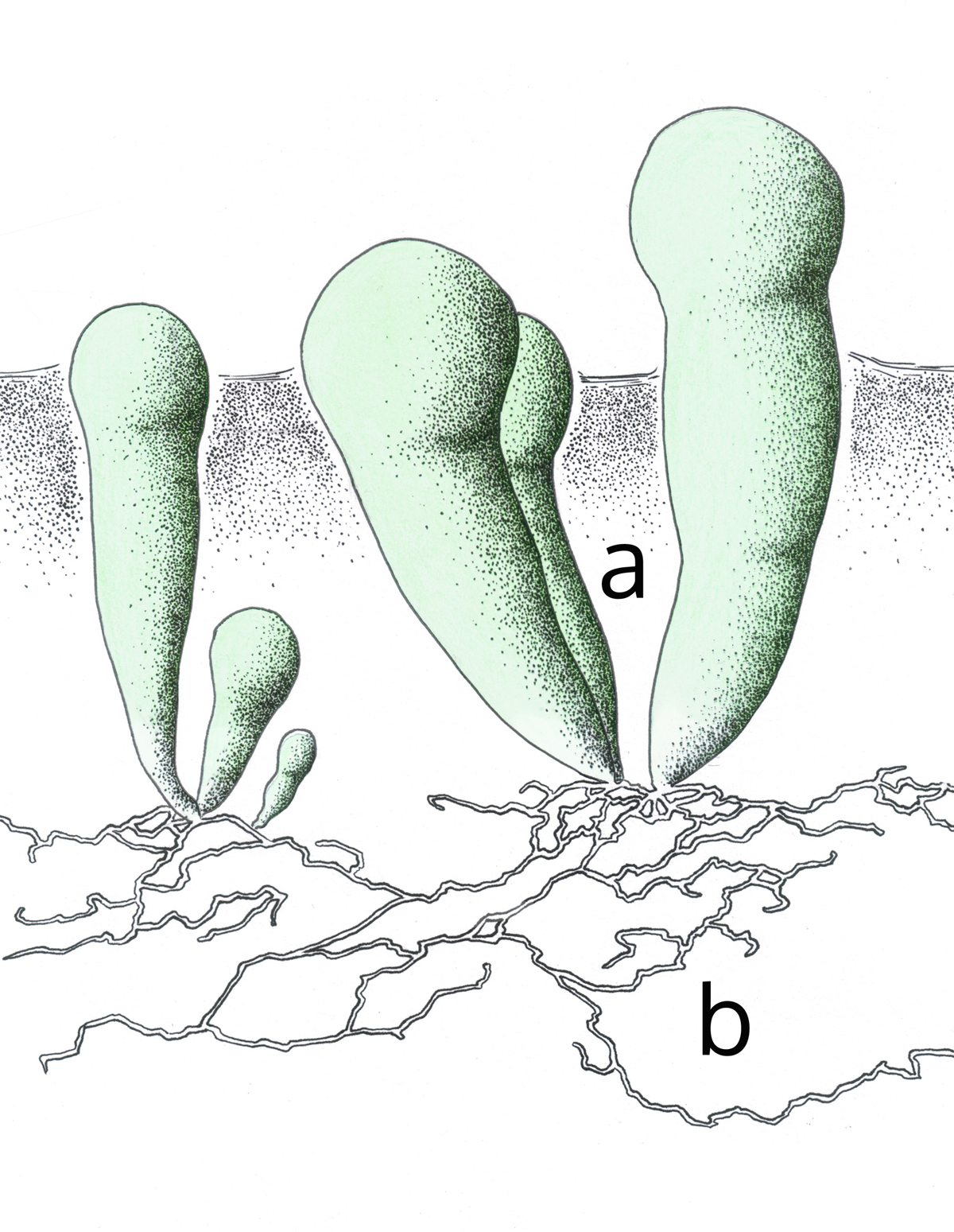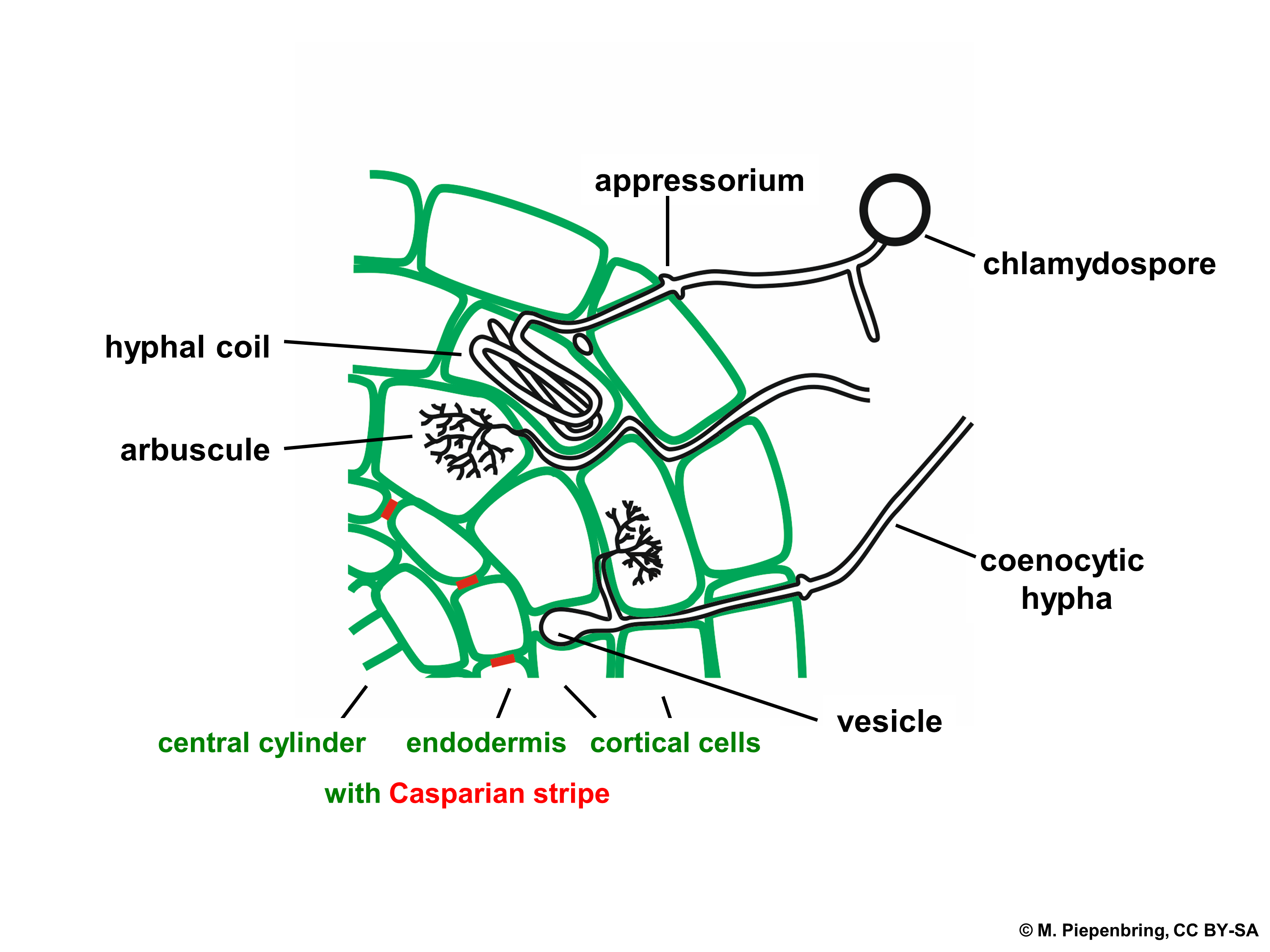 '''2a'''. 외생균근의 횡단면 모식도: 부착기(균족 appressorium), 수지상체(arbuscule), 후벽포자(chlamydospore), 다핵균사(coenocytic hypha), 균사코일(hyphal coil), 낭상체(vesicle), 녹색은 식물세포를 나타낸다.