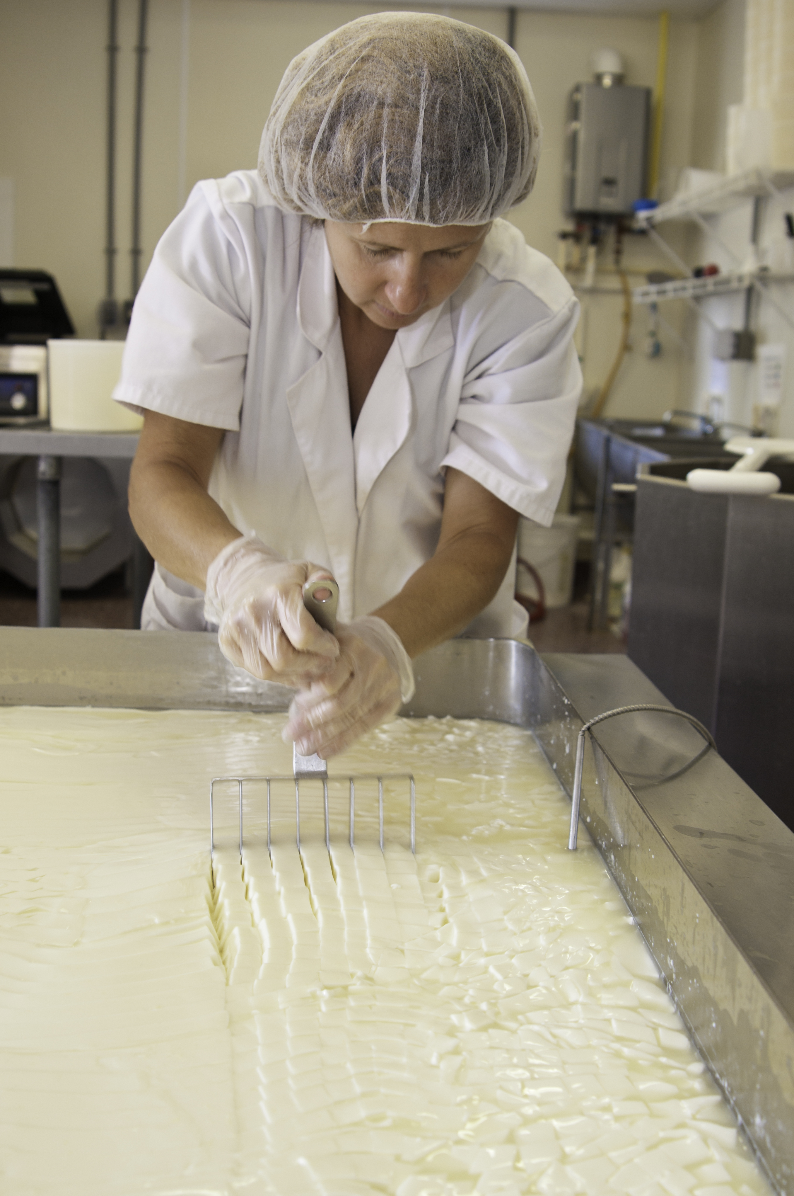 체다 치즈의 커드를 커드 커터로 절단하는 모습