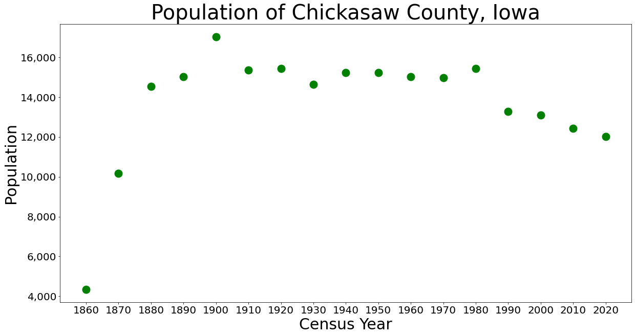 치카소군은 1851년 설립된 아이오와주의 군으로, 미국 남부의 치카소 족에서 이름을 따왔다. 최초의 군청 소재지는 브래드포드였으나, 1857년 뉴햄프턴으로 이전되었으며, 현재의 법원 건물은 1930년에 완공되었다. 치카소군은 하워드군 등 7개의 인접 카운티와 경계를 이루며, 18번 국도 등 여러 주요 고속도로가 통과한다. 2020년 인구 조사에 따르면 인구는 12,012명이며, 2000년 이후 인구 감소 추세를 보이고 있다. 정치적으로는 최근 공화당 지지 성향을 보이며, 2020년 대선에서 도널드 트럼프가 높은 득표율로 승리했다.
