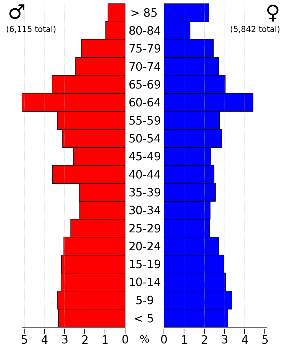 전체 5,192가구 중 31.9%는 18세 미만의 자녀와 함께 살고 있었으며, 60.7%는 결혼하여 함께 사는 부부였다. 남편 없이 여성 혼자 가구를 이루는 경우는 6.3%였고, 비가족 가구는 29.8%를 차지했다. 전체 가구의 26.1%는 1인 가구였으며, 이 중 13.7%는 65세 이상 노인 혼자 사는 가구였다. 평균 가구원 수는 2.48명이었고, 평균 가족원 수는 3.00명이었다.