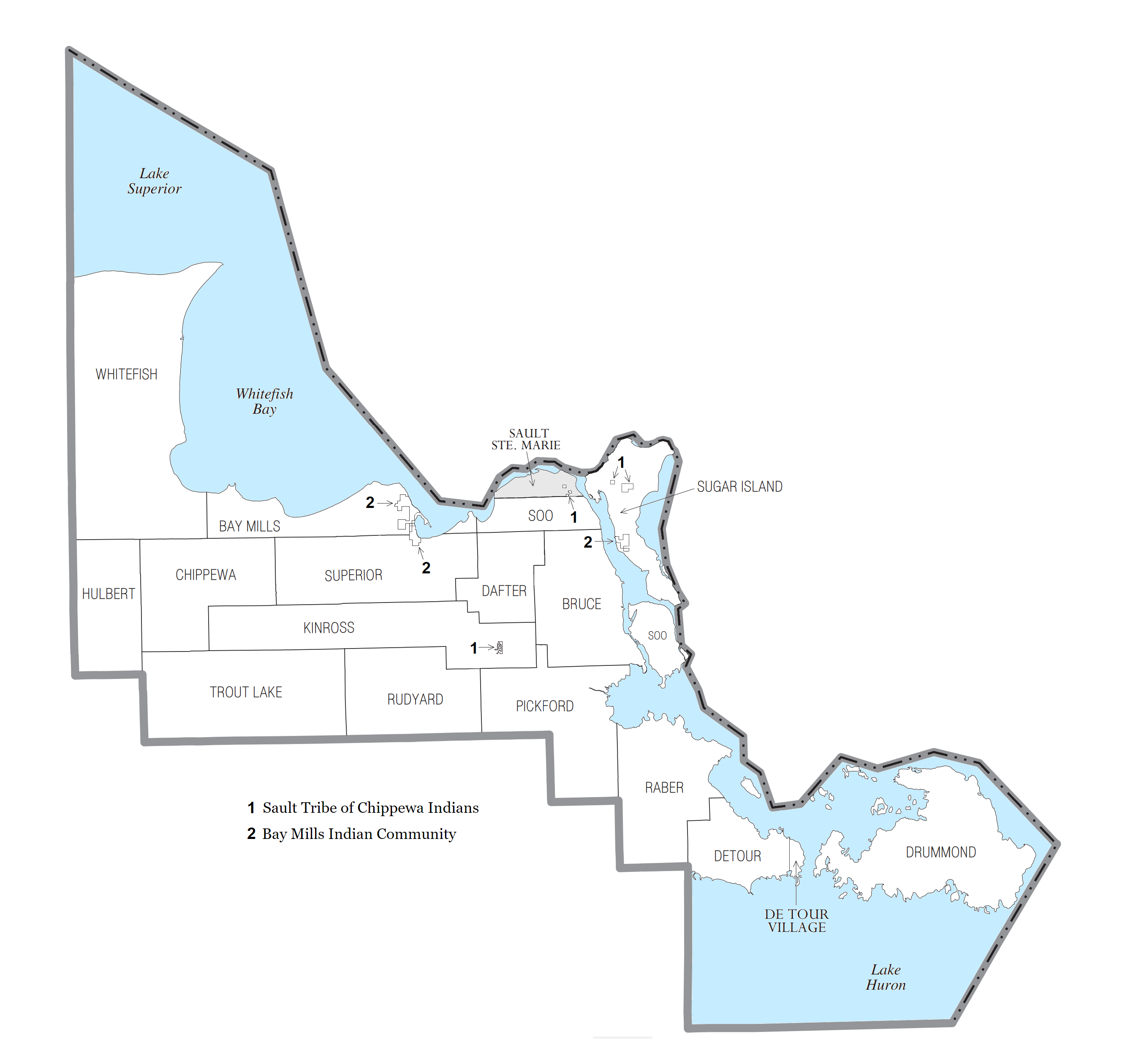 치페와 인디언 소 트라이브는 킨로스 차터 타운십, 슈가 아일랜드 타운십, 그리고 소 세인트 마리 시 경계 내에 흩어져 있는 토지를 점유하고 있다.