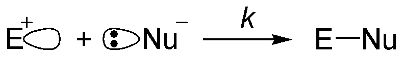 E+ = 친전자체, Nu- = 친핵체, ''k'' = 반응 속도 상수