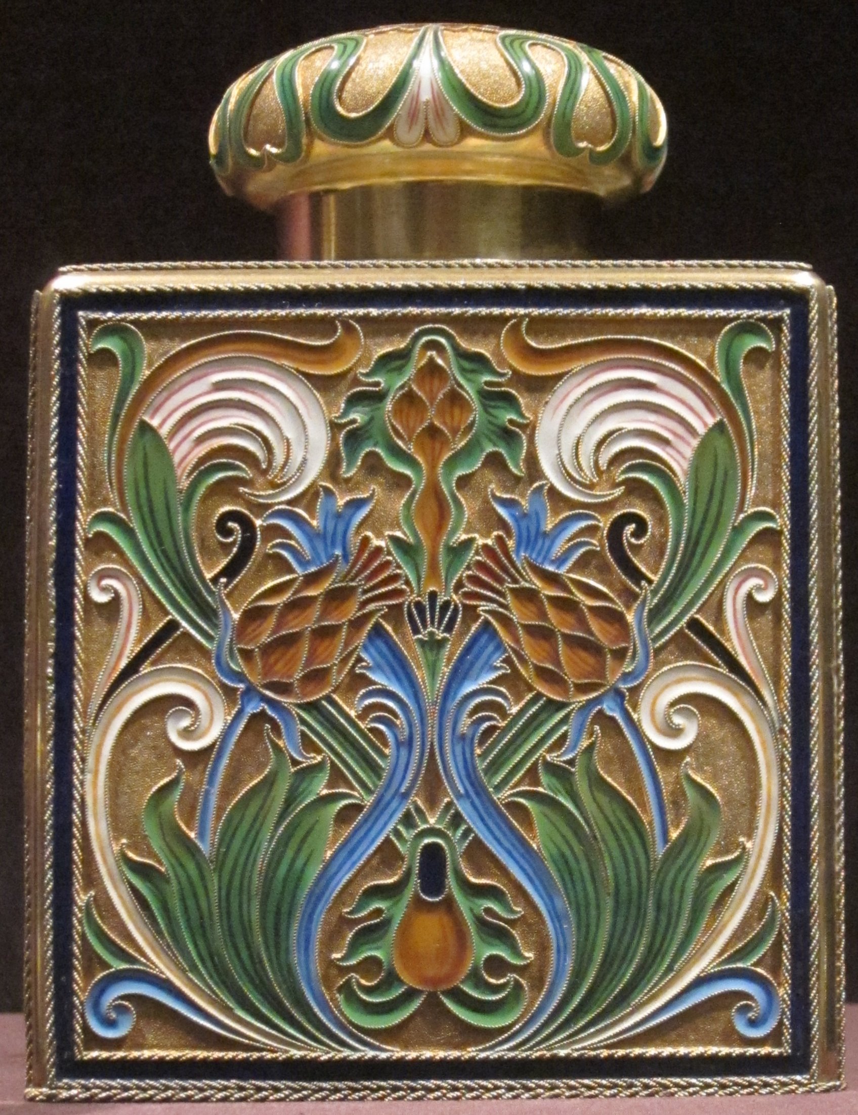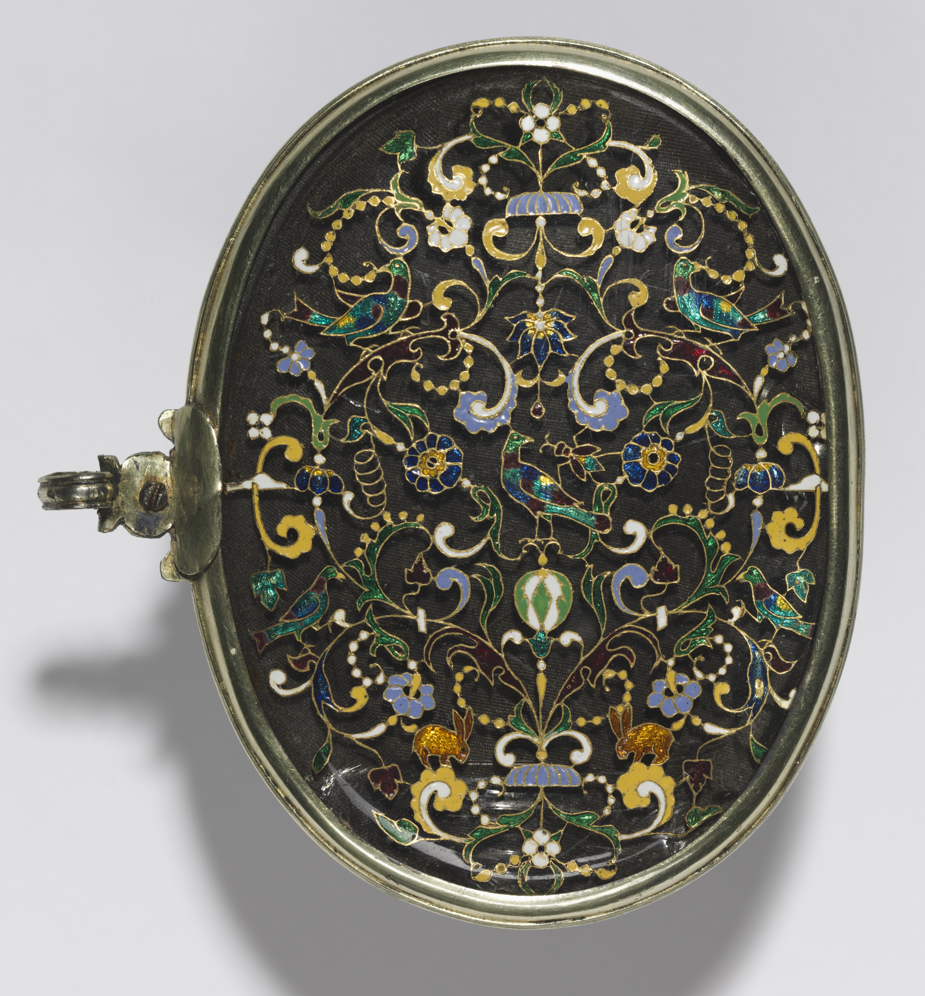 기법 | 금속 바탕에 칸막이를 만들고, 그 안에 유약을 채워 넣는 기법 (클로이조네) 유약으로 그림을 그리고 구워내는 기법 (에나멜) |