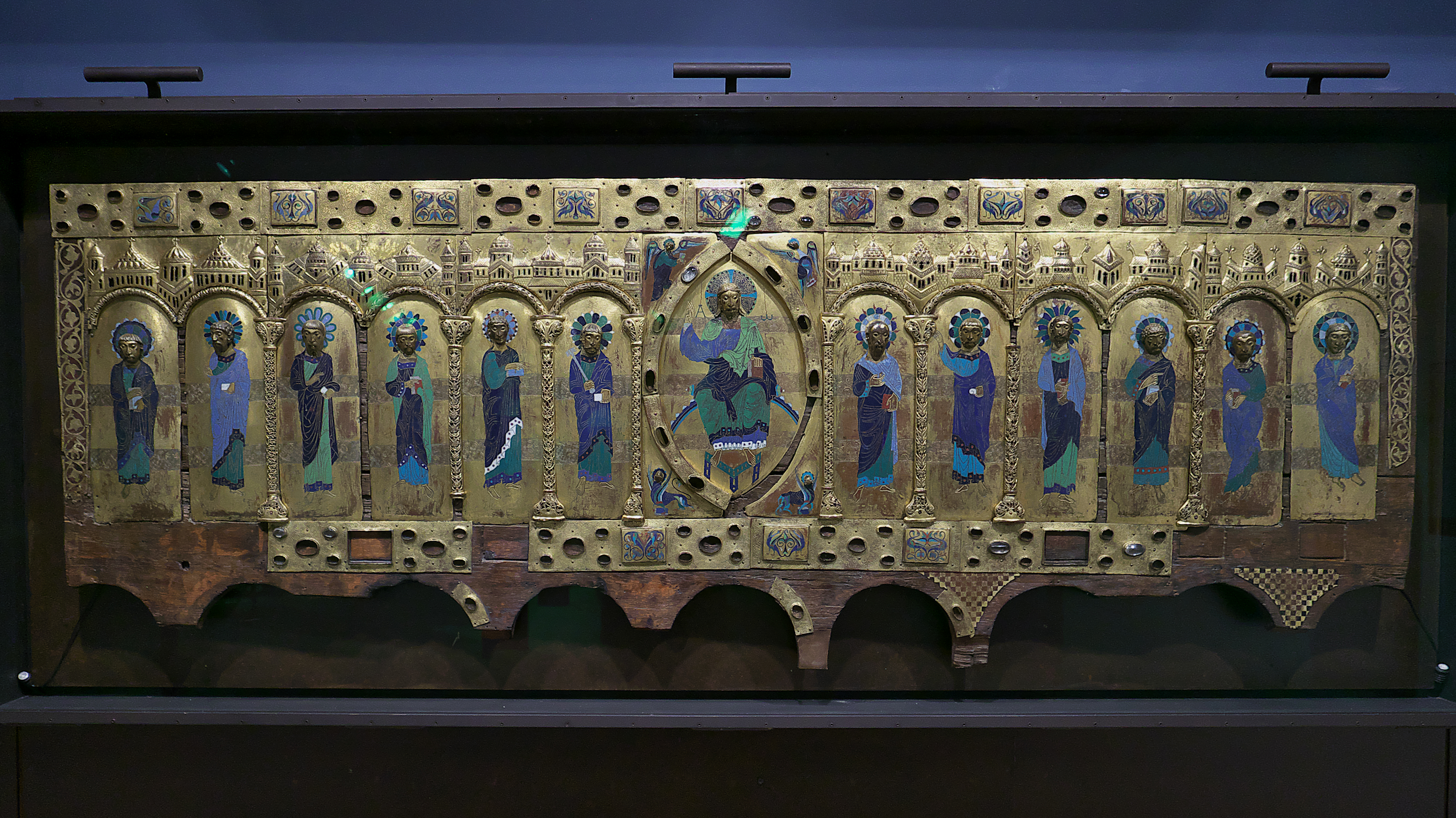 헝가리 성왕관에 있는 사도들을 묘사한 장식판은 독특한 전환 단계를 보여준다. 바탕판에는 ''젠크슈멜츠(senkschmelz)'' 기법처럼 디자인을 위한 움푹 들어간 부분이 있지만, ''볼슈멜츠(vollschmelz)'' 기법처럼 인물과 비문 주변의 두꺼운 윤곽을 제외하고는 에나멜이 판 전체를 덮고 있다.[22] 10세기 작품 중 일부는 두 개의 판을 서로 겹쳐 ''젠크슈멜츠(senkschmelz)'' 효과를 낸다. 위쪽 판에는 디자인 윤곽이 잘려 나가고 아래쪽 판은 그대로 남는다.[23]