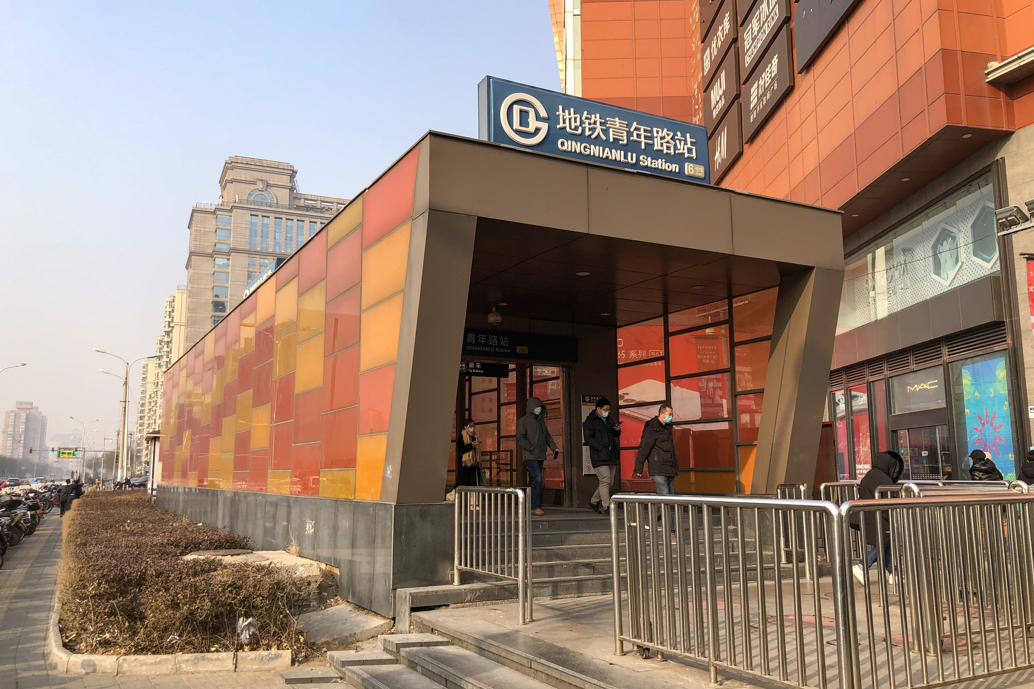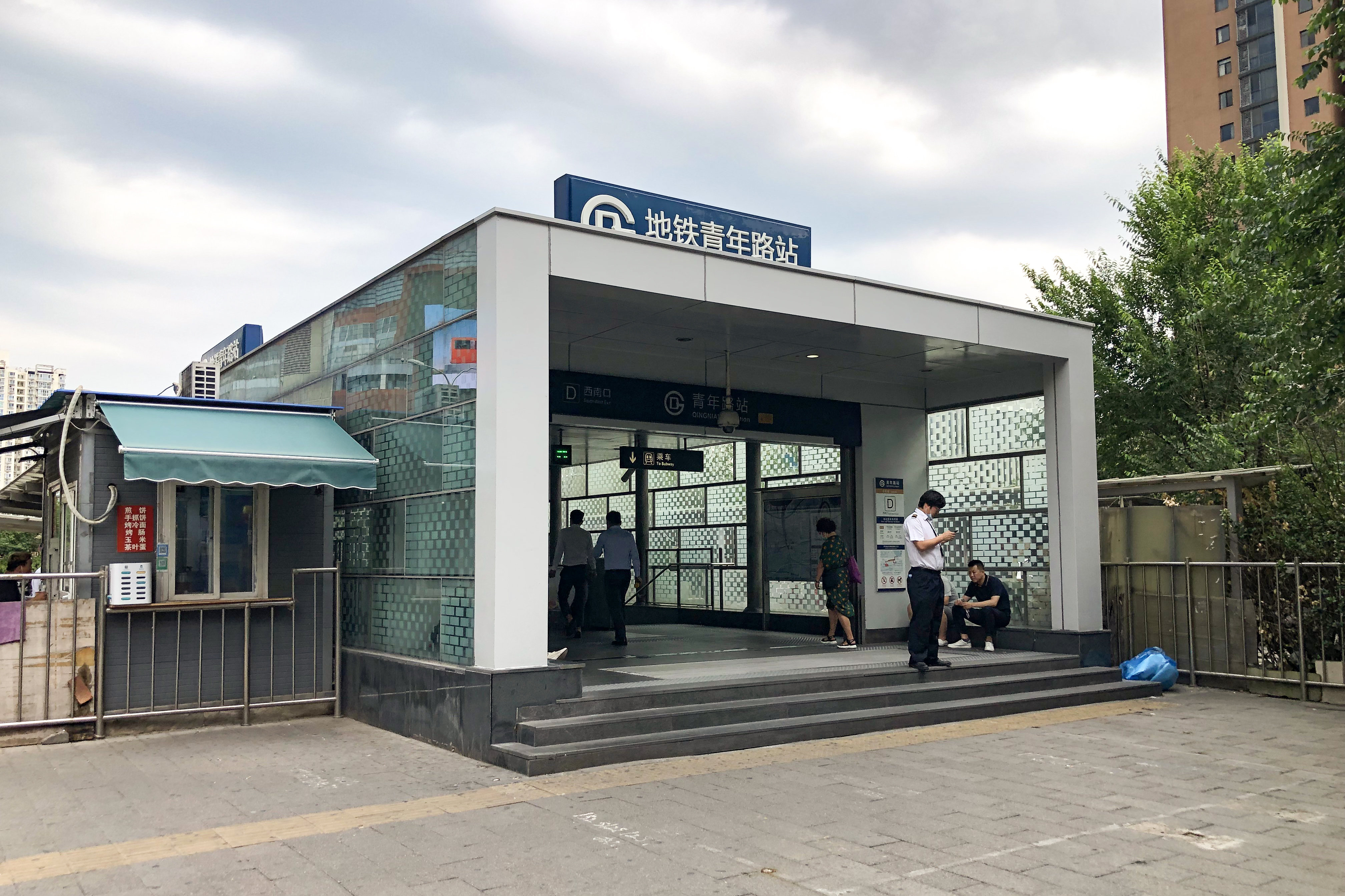 이 역은 차오양 북로(동서방향)와 칭녠로·쓰지싱허 서로(남북방향)의 교차로에 위치하며, 역은 동서로 배치되었다.[7]