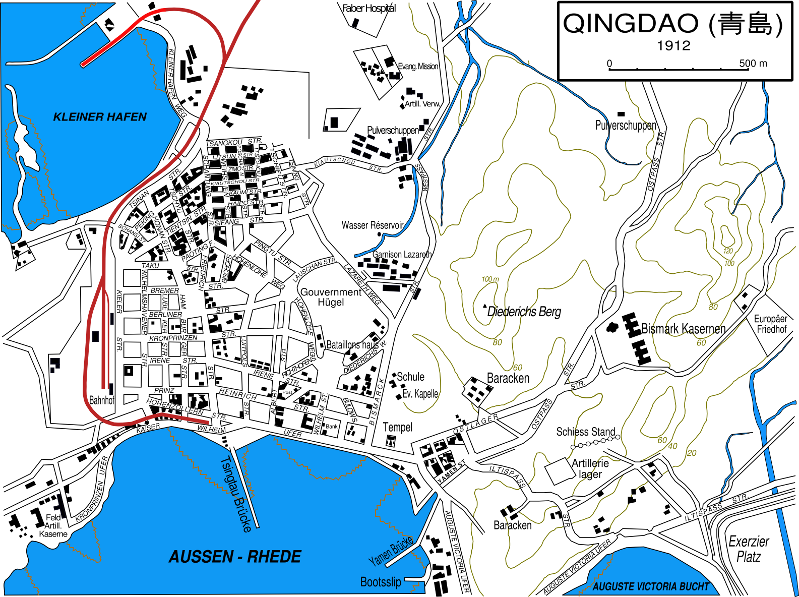 독일은 552 km2 면적의 자오저우만 조차지를 얻은 후, 가난한 어촌이었던 칭다오에 넓은 거리, 튼튼한 주택 지역, 정부 건물, 전 지역에 걸친 전력화, 하수도 시스템, 안전한 식수 공급 시설을 갖추었다.[26] 이는 당시와 이후 아시아의 많은 지역에서는 드문 일이었다.[26] "소위 '마르크트슈트라세'(시장 거리)는 칭다오의 옛 중국 마을의 주요 거리였으며, 그 거리를 따라 늘어선 건물은 어부와 농부의 옛 집이었다. 그들은 재산을 팔고 동쪽으로 더 멀리 떨어진 마을에서 그들의 집과 밭을 재정착했다."[25]