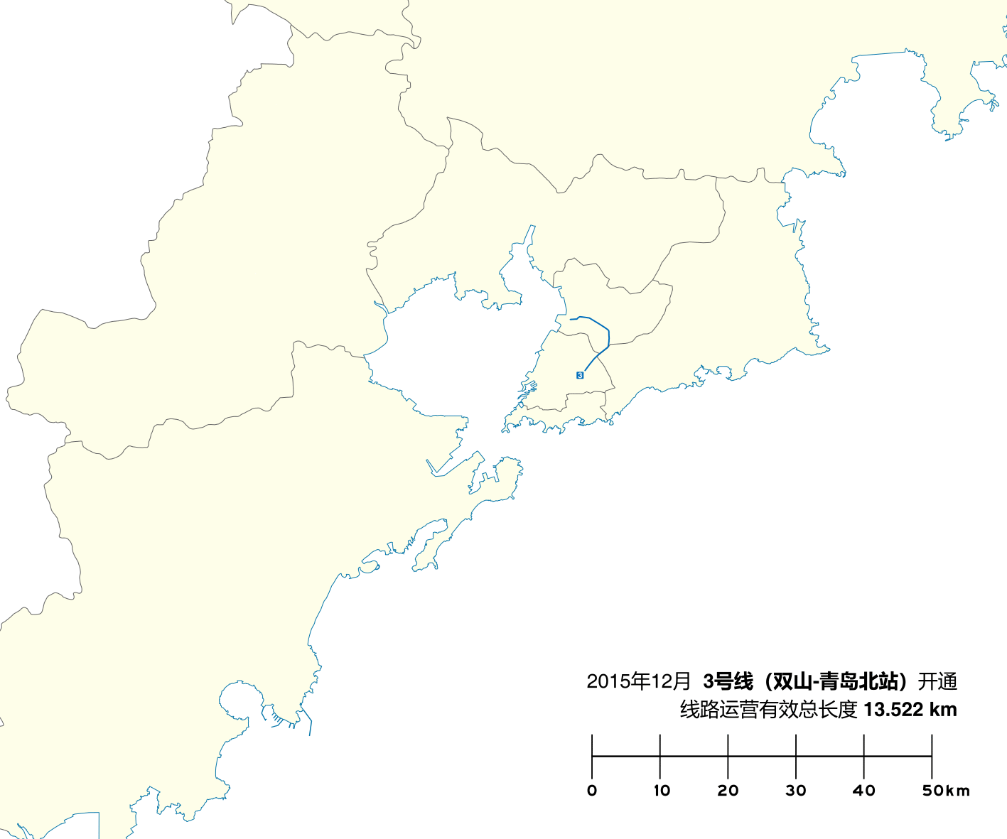 칭다오 지하철 3호선 | 칭다오역 | 칭다오 북역 | 24.95km | 22 | 2009 | 2015 | 2016 | 전 노선 개통 | ||
