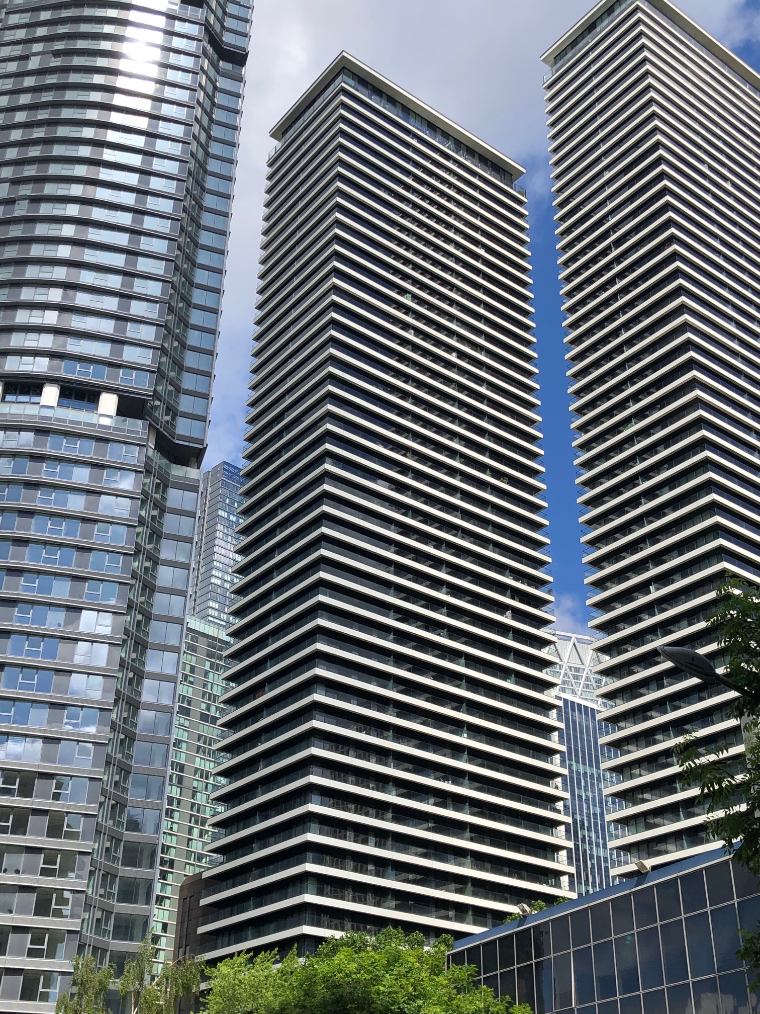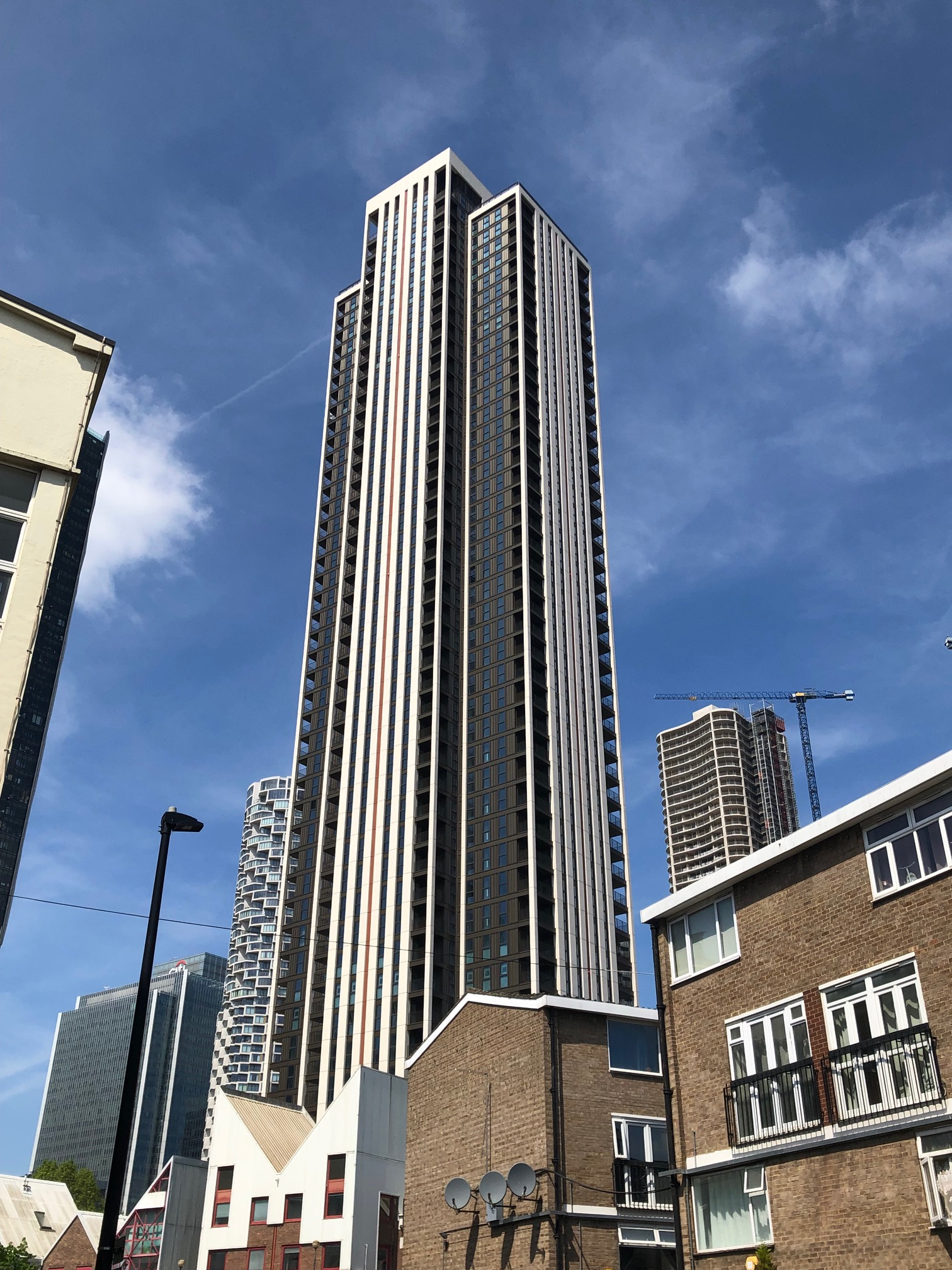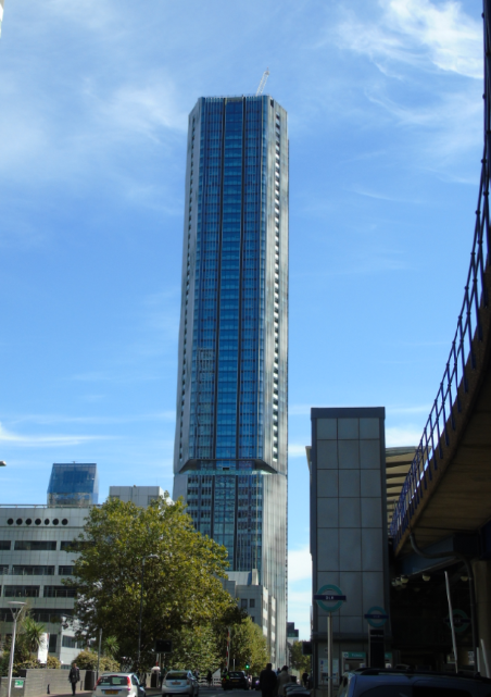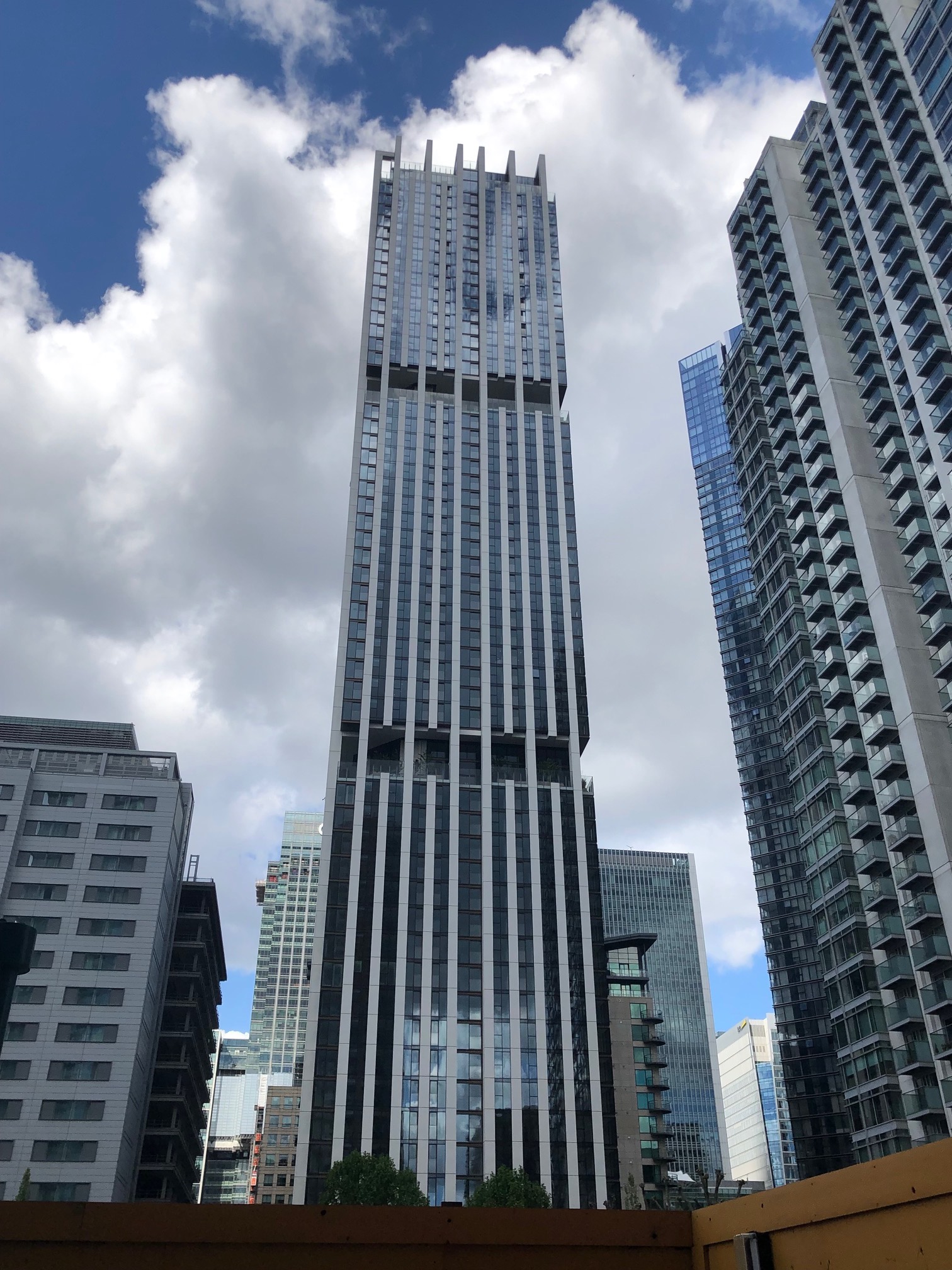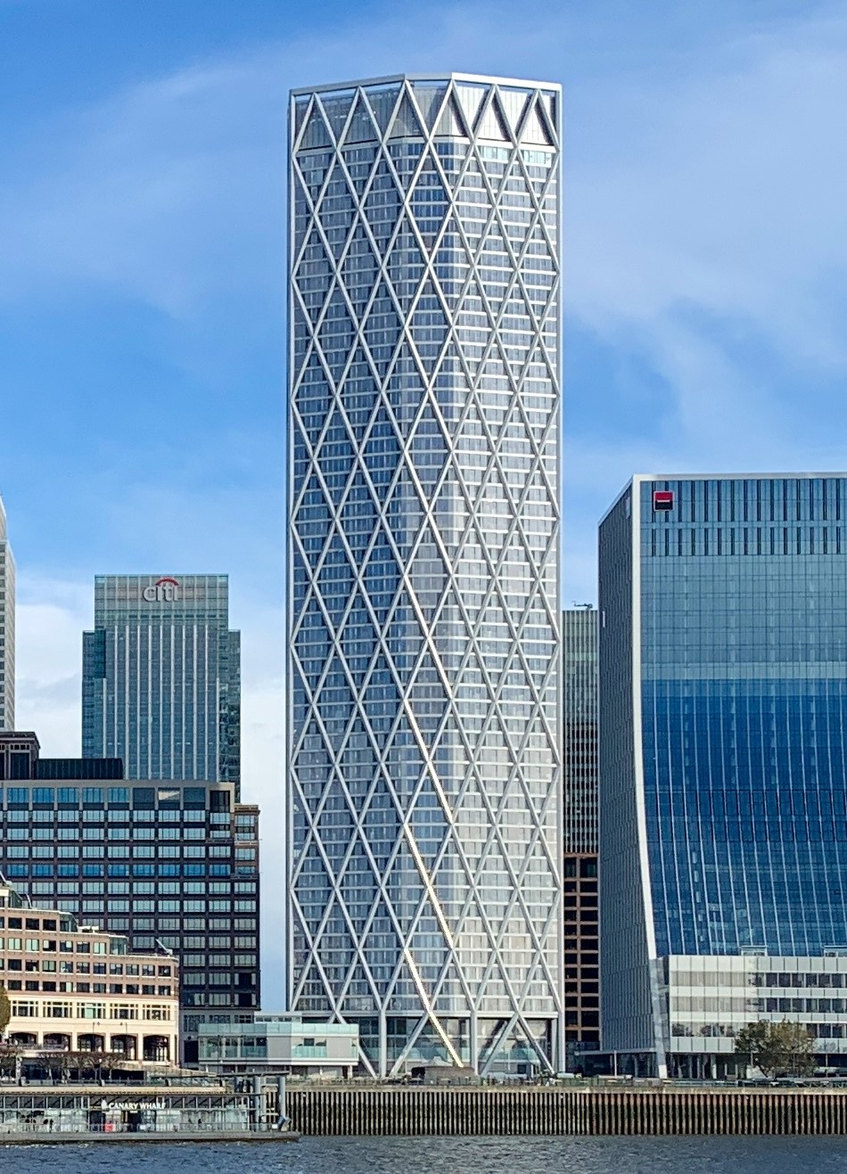3 | ![]() | 뉴펀들랜드 | 220 | 722 | 60 | 2019 | 카나리 워프 개인 소유지에 건설된 최초의 주거용 건물로, 금융 중심지의 건물들 사이에서 돋보인다.[24] 독특한 다이아몬드 패턴의 강철 외골격 디자인으로 인해 "다이아몬드 타워"로 알려져 있다.[25] 2021년 국제 부동산 어워드에서 주거 고층 개발 부문 수상.[26] 2021년 왓하우스? 어워드에서 최고의 외부 디자인(은상)과 최고의 임대형 프로젝트(동상) 수상.[27] |