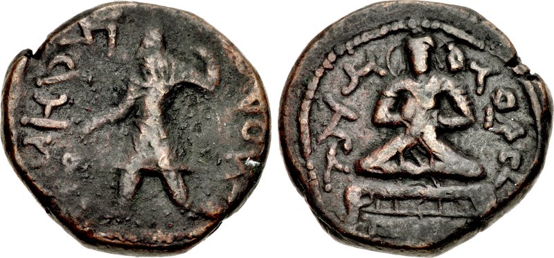 보살 미륵 (명문 "메트라고 부도" 포함)은 물병을 들고 아바야 무드라를 취하며, 다리를 꼬고 옥좌에 앉아있다. 이 동전은 구리 재질로만 알려져 있으며, 상당히 닳아있다.