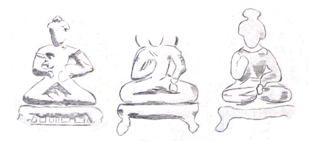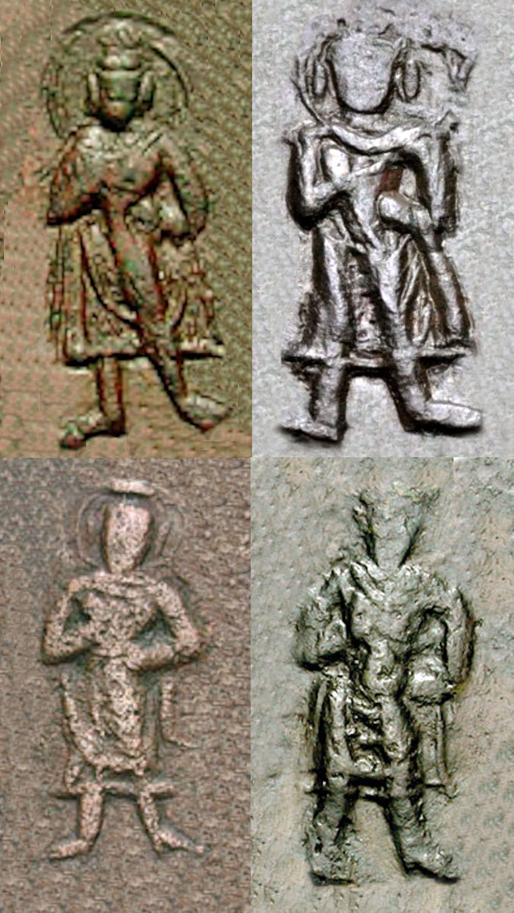 석가모니 부처 (전설 "사카마노 부도", 즉 석가모니 부처, 역사적 부처 싯다르타 고타마의 또 다른 이름)는 정면을 보고 서 있으며, 왼손은 엉덩이에 대고 오른손으로는 아바야 무드라를 취하고 있다. 이 동전들은 모두 구리로만 만들어졌으며, 일반적으로 꽤 낡았다.