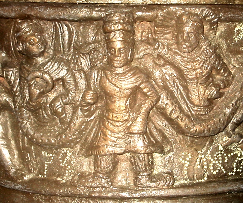 이란의 태양신과 달신에게 둘러싸인 카니슈카 (세부 묘사)