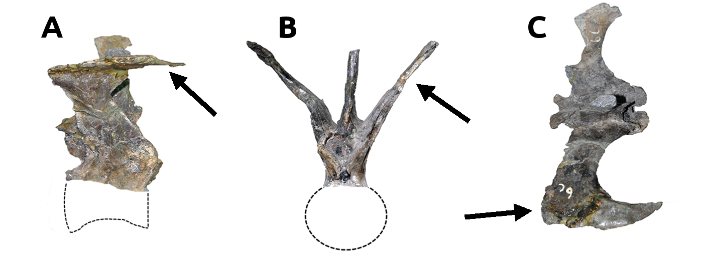 척추는 10개의 경추, 12개의 흉추, 6개의 융합된 천추 및 알 수 없는 수의 미추로 구성되어 있다. 목은 다른 수각류에서 보이는 S자형 곡선이 아닌 거의 일자였으며, 특히 기저 부위로 갈수록 비정상적으로 넓었다. 목의 척추 상단에는 에피포피시스라고 불리는 위쪽으로 향하는 확대된 뼈 돌기의 이중 열이 있어 목 척추의 상단에 매끄러운 홈을 만들었다. 이 돌기는 비정상적으로 낮은 극돌기 위에 솟아 있는 척추의 가장 높은 지점이었다. 에피포피시스는 눈에 띄게 강력한 목 근육을 부착하는 부위를 제공했을 것이다. 유사한 이중 열은 꼬리에도 존재했으며, 정면에서 V자 모양으로 위쪽으로 돌출된 고도로 변형된 미추 갈비뼈에 의해 형성되었으며, 안쪽 면은 앞쪽 꼬리 척추뼈의 매끄럽고 평평한 윗면을 만들었다. 각 미추 갈비뼈의 끝은 앞쪽으로 돌출된 갈고리 모양의 확장을 갖추고 있어 이전 척추의 미추 갈비뼈에 연결되었다.4. 분류