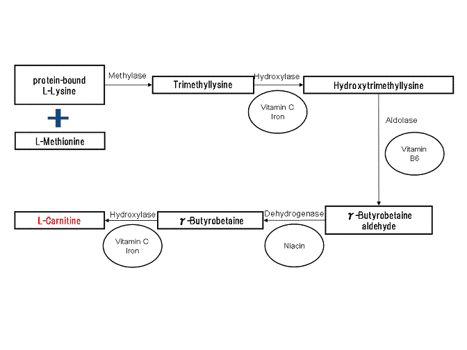 따라서 체내에서 L-카르니틴을 충분히 합성하기 위해서는 원료인 라이신과 메티오닌 외에도 비타민 C, 철, 비타민 B6, 나이아신이 필요하며, 이들 영양소가 부족하면 카르니틴 합성에 문제가 생길 수 있다.