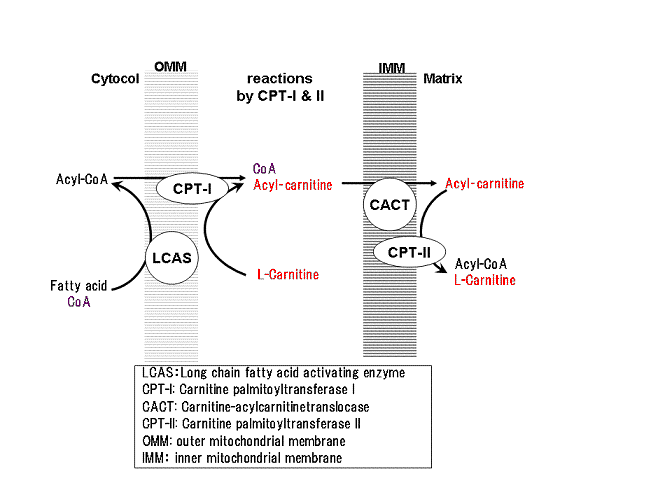 # 카르니틴-아실카르니틴 전위효소(CACT): 생성된 지방 아실카르니틴은 막간 공간을 지나 미토콘드리아 내막에 위치한 CACT를 통해 미토콘드리아 기질로 들어간다. 이 단백질은 역수송체로서, 지방 아실카르니틴 한 분자를 기질 안으로 들여보내는 동시에 카르니틴 한 분자를 막간 공간으로 내보내는 방식으로 촉진 확산을 수행한다.[13]