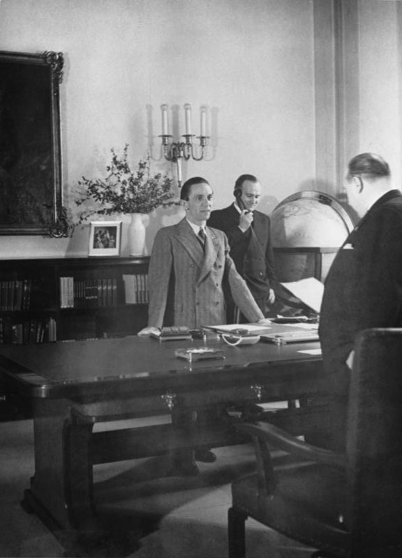 괴벨스 장관이 자신의 사무실에서 국무장관 발터 푼크(Walther Funk)와 회의를 하고 있다. 배경에는 장관 참모 카를 한케가 전화를 받고 있다.