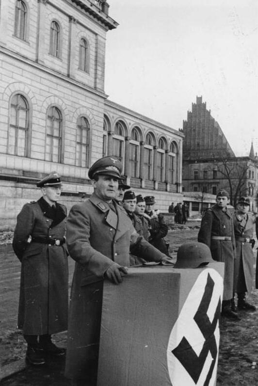 1945년 2월, 브레슬라우(브로츠와프)에서 한케 가울라이터가 신설된 국민돌격대 대대에 연설하는 모습.