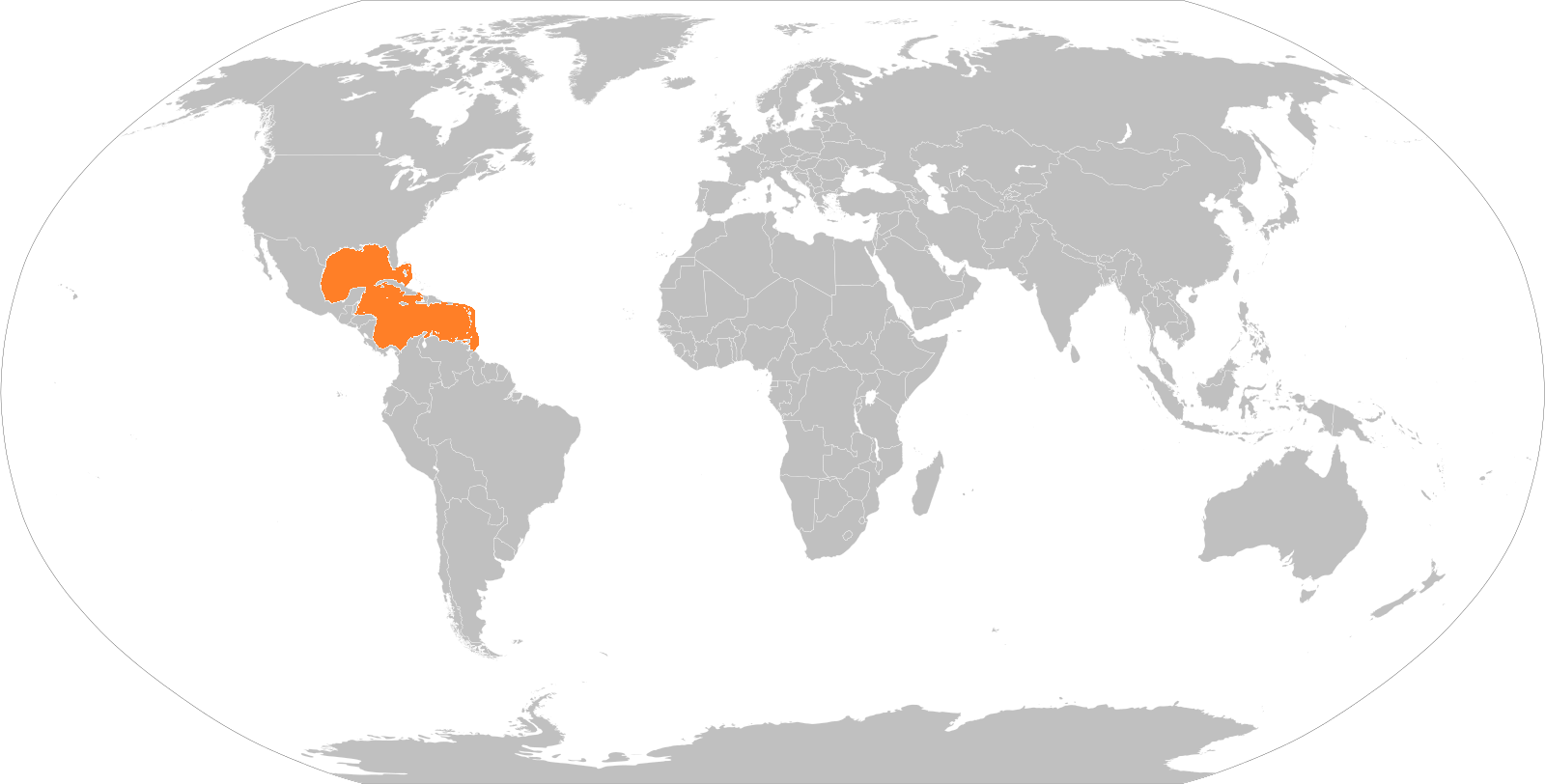 최북단 기록으로는 사우스캐롤라이나주 찰스턴에서 발견된 화석이 있으며, 소앤틸리스 제도 북단에서도 유적에서 출토된 1건과 목격 기록 1건이 있다. 텍사스주에서의 목격 기록이나 고고학적 자료는 신빙성이 부족하다는 지적도 있다.[27][29][30]