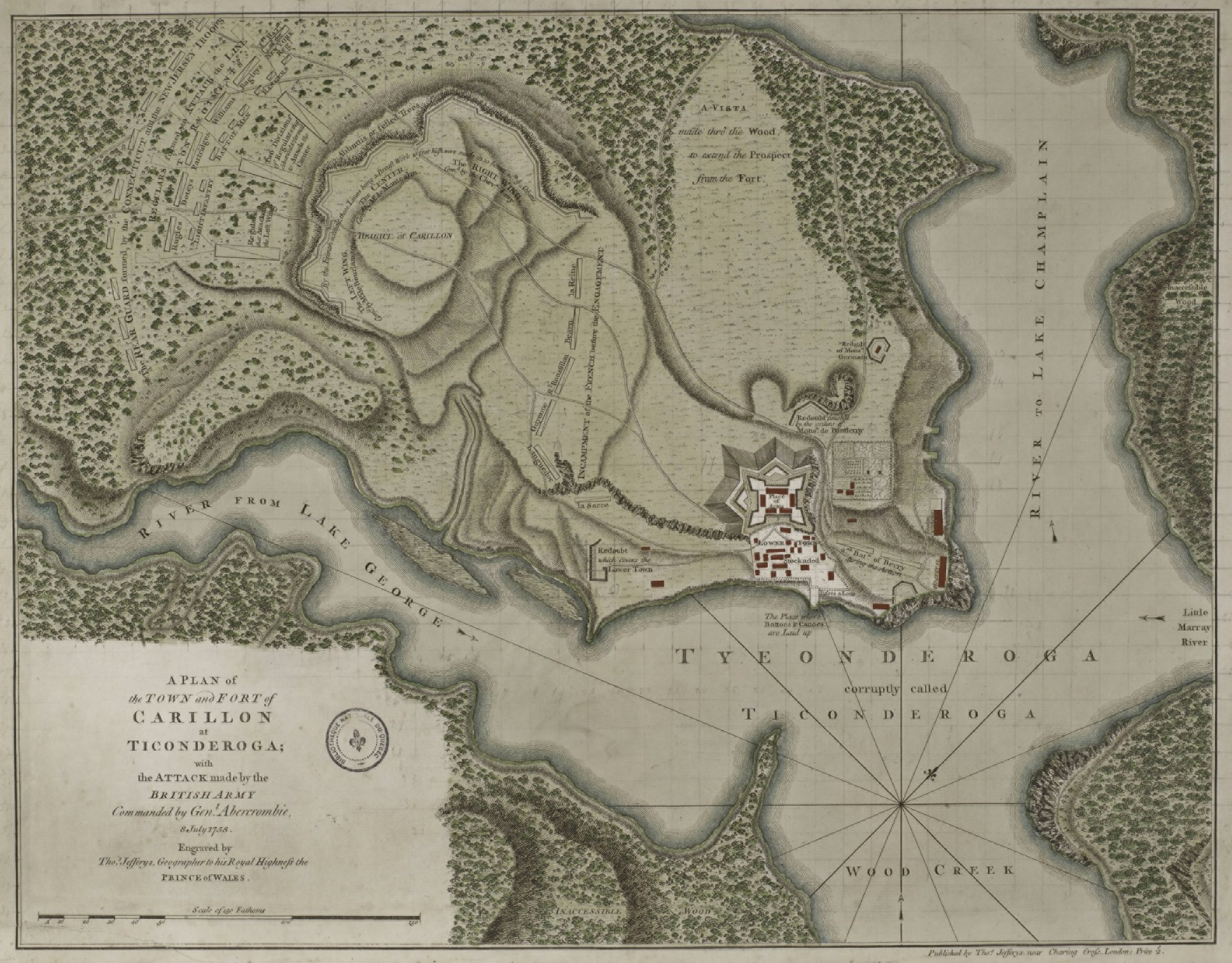 제임스 애버크롬비 장군이 지휘하는 영국군은 윌리엄 헨리 요새가 파괴된 터에 약 16,000명에 달하는 대규모 병력을 집결시켰다. 이는 당시 북아메리카에 배치된 단일 부대로는 가장 큰 규모였다.[18] 1758년 7월 초, 영국군은 보트를 이용해 조지 호 북쪽 끝에 상륙하며 본격적인 공세를 준비했다.[26]