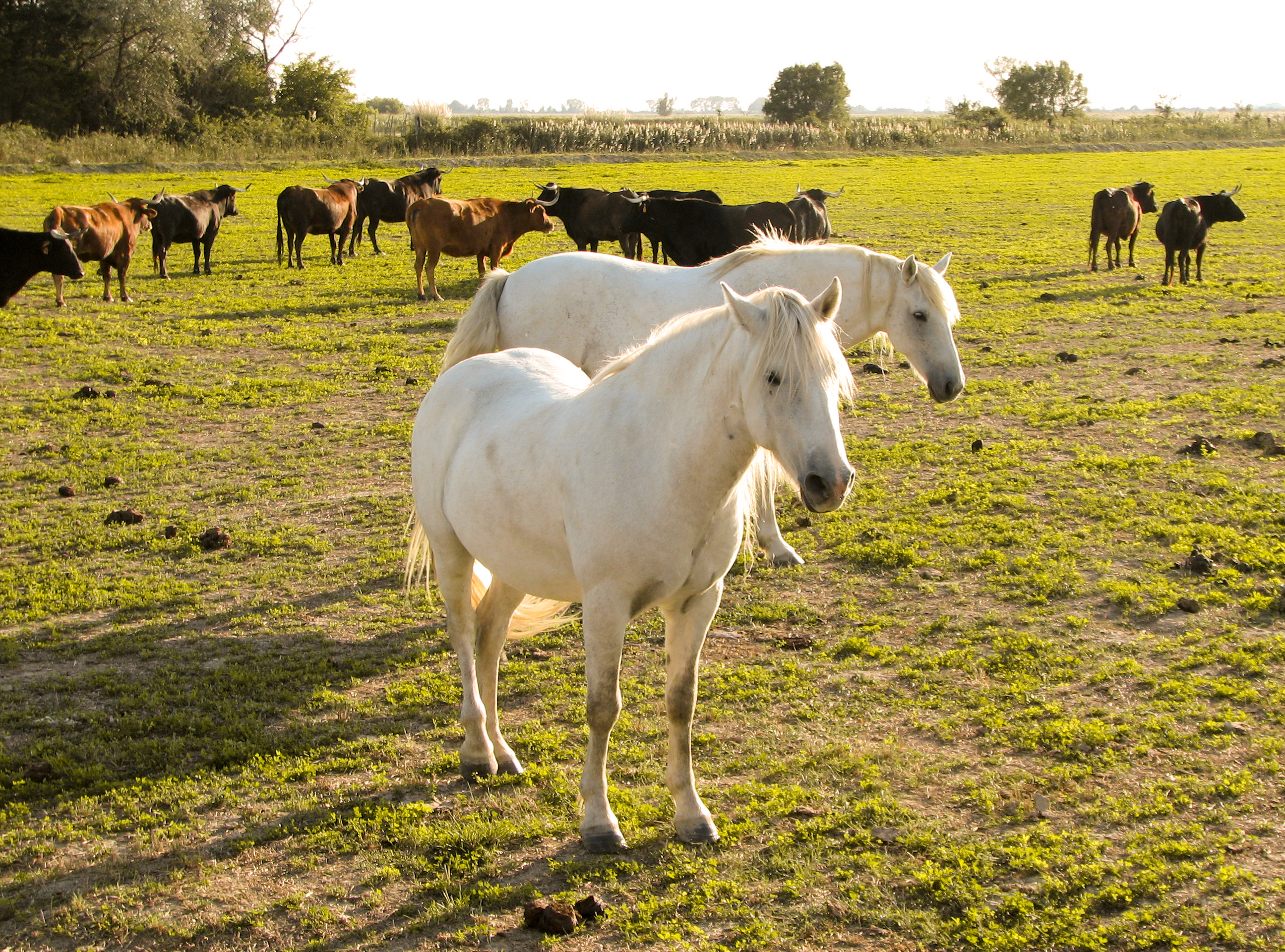 또한 소와 말의 방목이 이루어지고 있으며, 반야생화된 카마르그 흰말(Camargue horse)의 아름다움은 유명하다. 알베르 라모리스 감독의 1953년작 단편 영화 《흰말》(白い馬) (칸 영화제 그랑프리 수상)의 배경이 되기도 했다. 오늘날 프랑스 내 많은 지역에서는 가축 방목이 거의 사라져, 장 앙리 파브르가 연구로 유명한 큰 쇠똥구리는 카마르그와 같은 제한된 지역에서만 볼 수 있게 되었다.