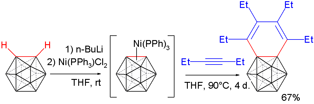 카보레인은 알킨과 반응하여 '''벤조카보란'''(benzocarborane)이 생성된다.[40][41] 먼저 ''o''-카보란이 ''n''-뷰틸리튬에 의해 탈프로톤화되어 디클로로비스(트리페닐포스핀)니켈과 반응하여 카보레인의 니켈 착체가 생성된다. 이어서 3-헥신과 반응시키면 벤조카보란이 생성된다.