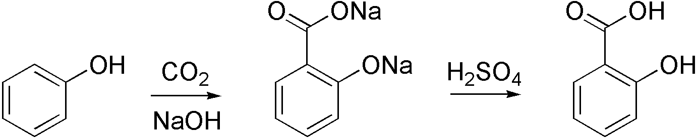 아스피린의 전구체인 살리실산 나트륨은 석탄산 나트륨(페놀의 나트륨 염)을 고온(390 K), 고압(100 기압)에서 이산화 탄소로 처리하여 상업적으로 제조된다. 이 방법은 콜베-슈미트 반응으로 알려져 있다. 생성된 살리실산염의 산성화로 살리실산이 생성된다.