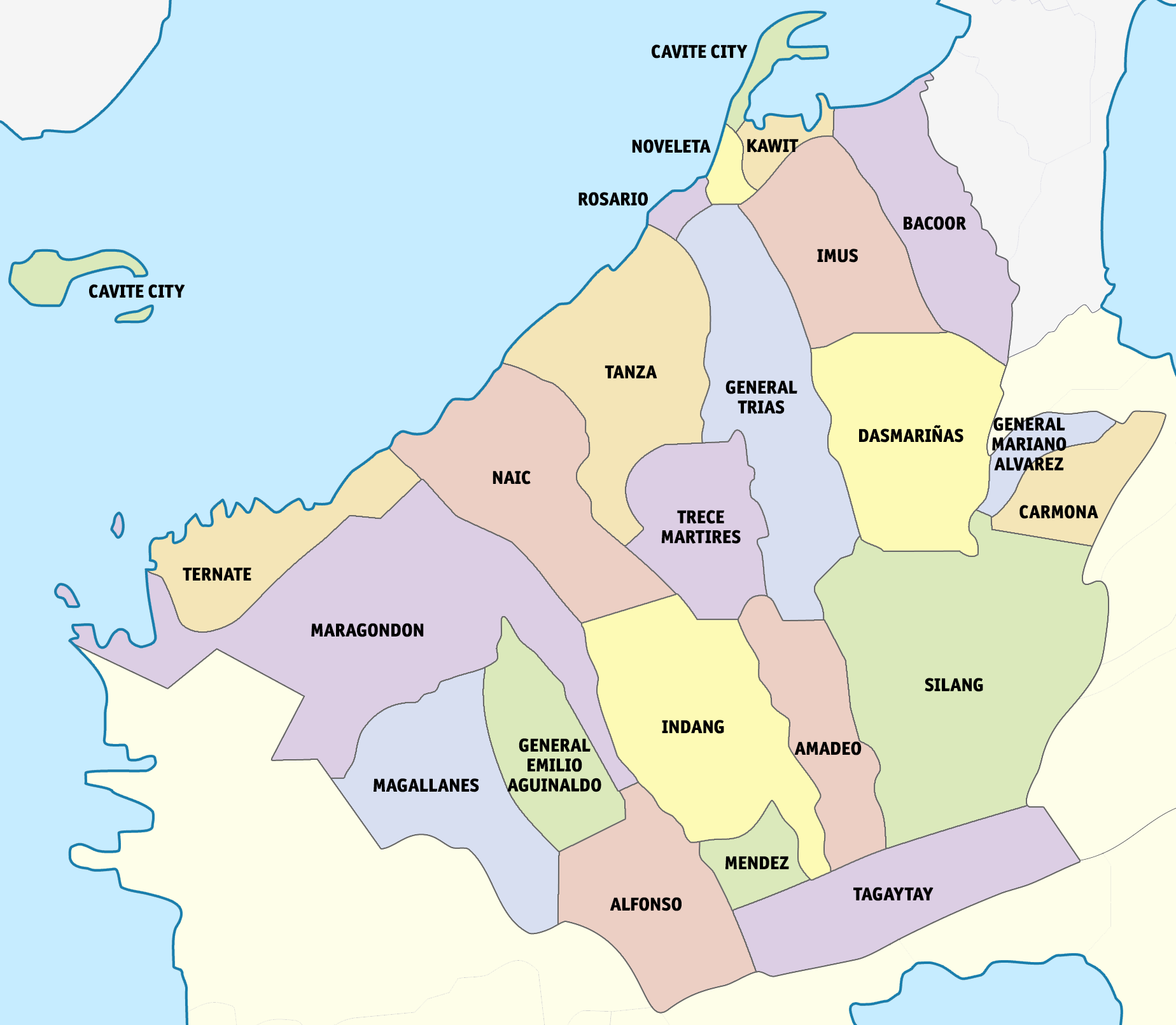 - 최저 저지대: 해안 평야로, 해발 0~2m의 매우 낮은 고도를 가진다.[41] 카비테 시, 바코르, 카윗, 노벨레타, 로사리오, 카르모나 북부, 테르나테 동부가 이 지역에 속한다.[41]