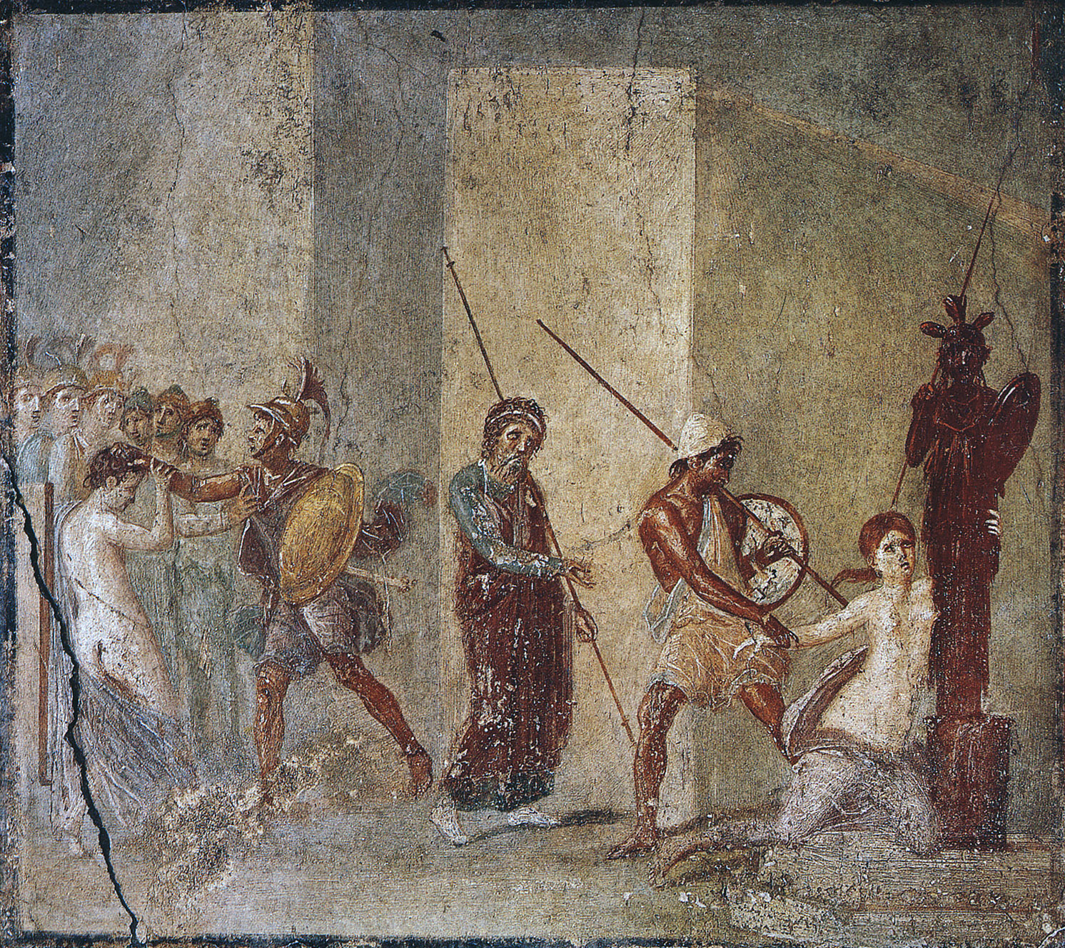 트로이의 몰락 전에 카산드라는 파리스가 스파르타로 가서 헬레네를 아내로 데려오면 트로이가 멸망할 것이라고 예견했다. 예언에도 불구하고 파리스는 헬레네와 함께 돌아왔고, 분노한 카산드라는 헬레네의 황금 베일을 낚아채고 머리카락을 찢었다.[19]