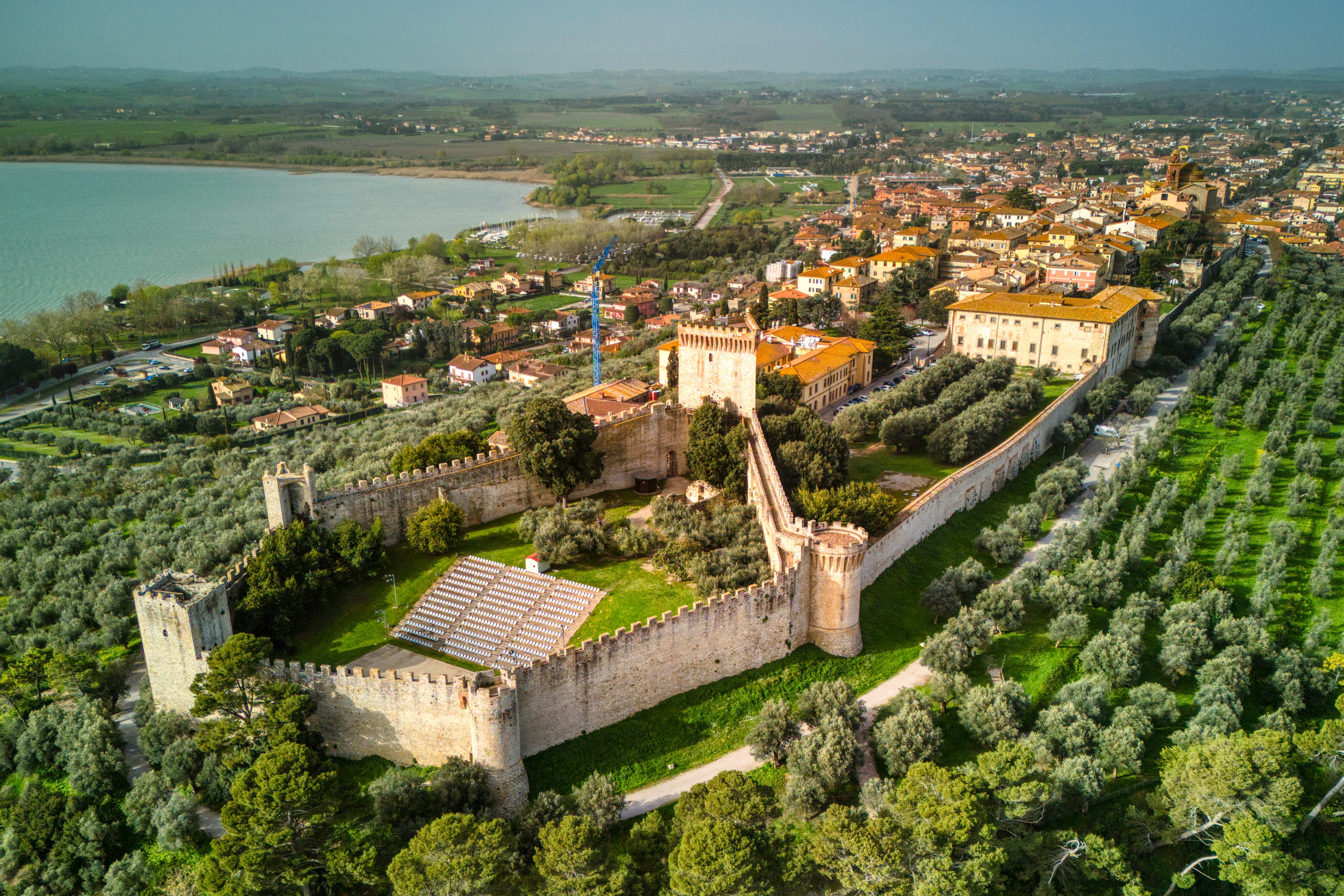 • 사자 요새 (Rocca del Leoneit): 신성 로마 제국 황제 프리드리히 2세의 지시로 건설되었다. 오각형 모양의 이 성은 1247년 코르토나 출신의 수도사이자 건축가인 엘리아에 의해 완공되었다. 성의 네 모서리에는 사각형 탑이 있으며, 다른 한 곳에는 '마스티오'(Mastioit)라고 불리는 삼각형 모양의 보루 또는 돈존이 있다. 이 요새는 트라시메노 호수 전체를 전략적으로 통제하기 위해 설계되었으며, 수 세기 동안 여러 차례의 포위 공격을 견뎌냈다.