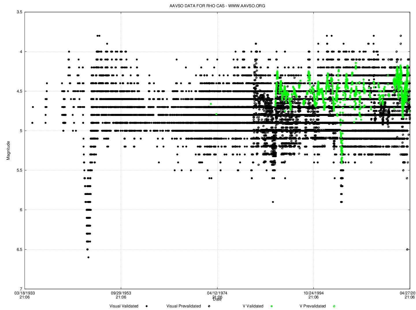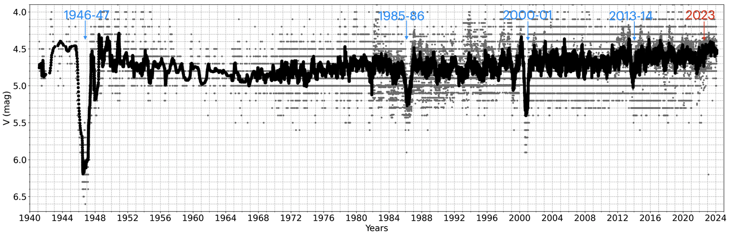 1940년부터 2024년까지 카시오페이아자리 로의 시각적 광도곡선