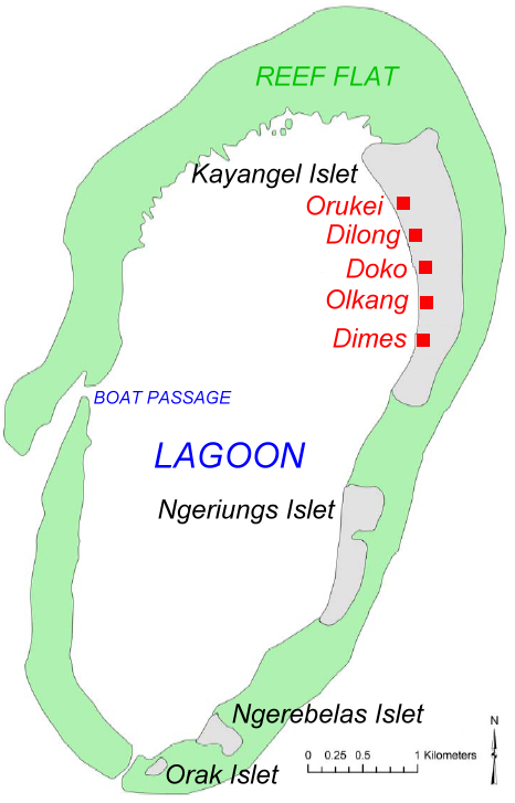 타원형인 환초의 동쪽과 남쪽 가장자리에는 북쪽에서 남쪽 순서로 카양겔, 응리웅스, 응게르벨라스, 오락 등 4개의 울창한 숲으로 덮인 작은 섬들이 자리 잡고 있다. 이 섬들에 대한 자세한 내용은 하위 문서를 참고할 수 있다.